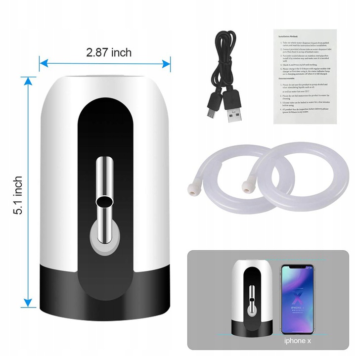 Водяний насос дуже зручний, і завдяки його компактним розмірам його можна брати куди завгодно. Проста і легка експлуатація. Просто занурте один кінець насоса в рідину і натисніть кнопку, яка знаходиться у верхній частині пристрою. У нижній частині трубки є крильчатка, яка всмоктує рідину, а потім вона витікає через кран. Висока ефективність і пропускна здатність 0 - 20 л балони можна спорожнити всього за 5 хвилин. Довжина гнучкої всмоктувальної трубки 60 см. Пристрій заряджається через USB-кабель.