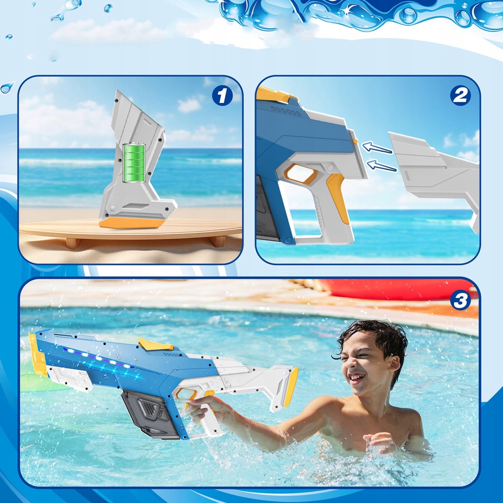 Електричний краскопульт забезпечує потужний струмінь і точність, що підвищує вашу впевненість у водних боях. Крім того, додано крутий світлодіодний підсвічування під час накачування води для розваги під час нічних вечірок біля басейну.
