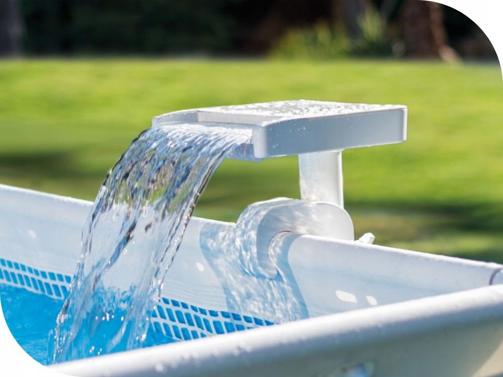 Це повністю водонепроникний і безпечний продукт для використання в басейнах. Фонтан підключається до насоса басейну потужністюхв. 3785 л/год,макс. 12 112 л/год. У комплект входять перехідники для шлангів діаметром 32 мм і 38 мм - підходить для всіх насосів вищевказаної потужності. Продукт можна встановити на будь-які каркасні басейни.