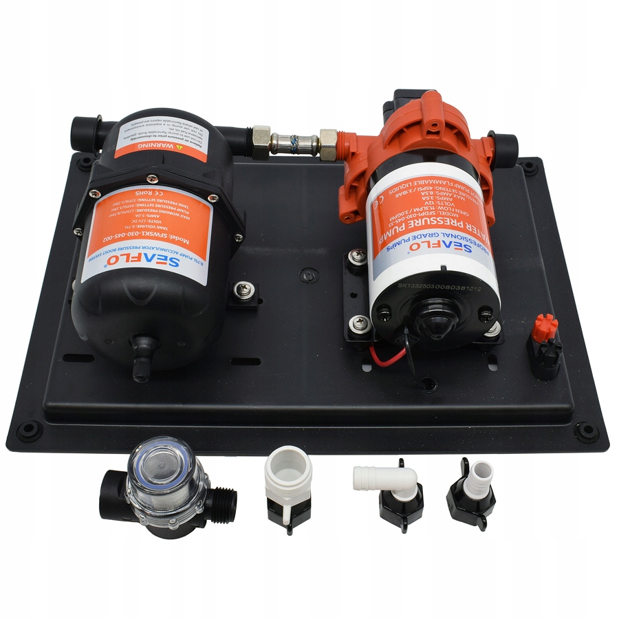 водяний насос тиску 12В 11,3 л/хв + розширювальний резервуар - Повний набір тиску складається з насоса тиску 3 -кембер, сітчастого фільтра та резервуара з електричними швидкими роз'ємами. Насос, розширювальний бак та електричні затискачі розміщуються на змонтованій пластині. Перевага такого рішення -це стабільний тиск та підвищення ефективності самостійного значення. Завдяки цьому набору достатньо для живлення 3 або більше приймачів води. Насос автоматично увімкнено в результаті падіння тиску (натисніть на відключення).