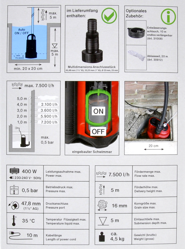 Просматривая «ВОДЯНИЙ НАСОС З ІНТЕГРОВАНИМ ПОПЛАВКОМ 7500л/год», вы можете быть уверены, что данный товар из каталога «Насосы и гидрофоры» будет доставлен из Польши и проверен на целостность. В цене товара, указанной на сайте, учтена доставка из Польши. Внимание!!! Товары для Евросоюза, согласно законодательству стран Евросоюза, могут отличаться упаковкой или наполнением.