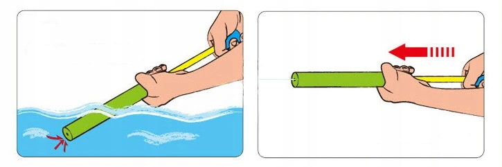 Поливалка виготовлена з піни, дуже легка та має ергономічна форма у вигляді трубок, що робить розваги ще приємнішими. Додатковою перевагою є простота експлуатації пістолета - він працює за принципом насоса, щоб набрати воду всередину, досить піднести насадку до струменя води, а потім потягнути за ручку.