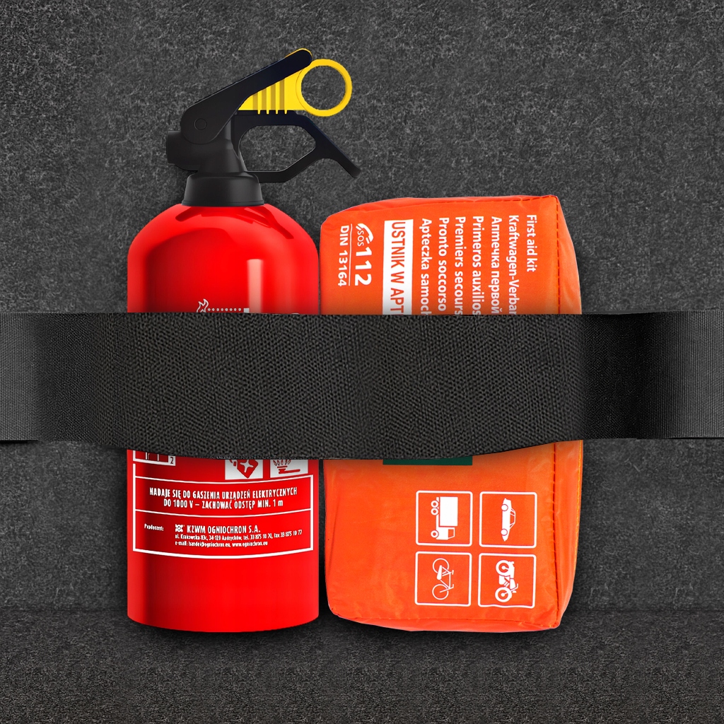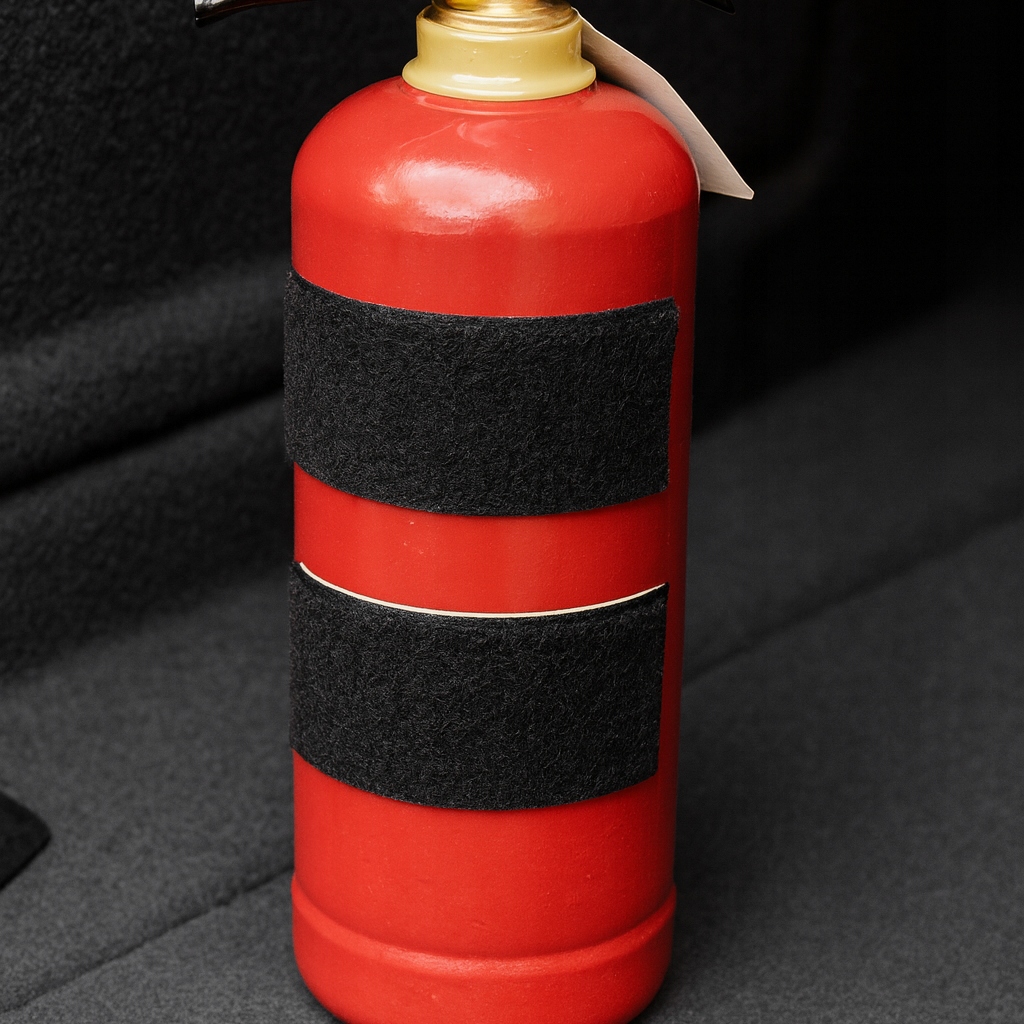 4️⃣ Притисніть вогнегасник разом із ремінцем до оббивки – липучка відразу «зачепиться» за поверхню.