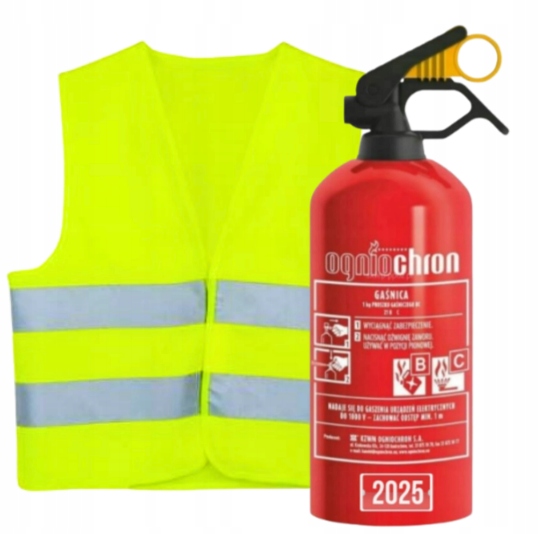 Вогнегасник автомобільний порошковий 1 кг БК з підвіскою 5 РОКІВ Ogniochron 2024 + AM 94-040 СВІТЛОВІДБИВАЮЧИЙ ЖИЛЕТ ЖОВТИЙ XXXL