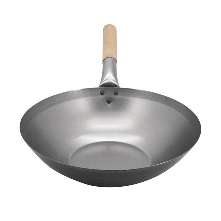 - Матеріал: Виготовлений з м’якої сталі, вок ідеально підходить для швидкого та рівномірного смаження. Сталь забезпечує довговічність і стійкість до високих температур, що робить її ідеальною для інтенсивного використання на завантажених кухнях.