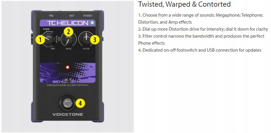 Керування TC Helicon VOICETONE. Спотворений або телефонний голос – чудовий спосіб привернути увагу аудиторії. VoiceTone X1 дає вам можливість відразу створювати ці ефекти за допомогою простої у використанні та доступної педалі.