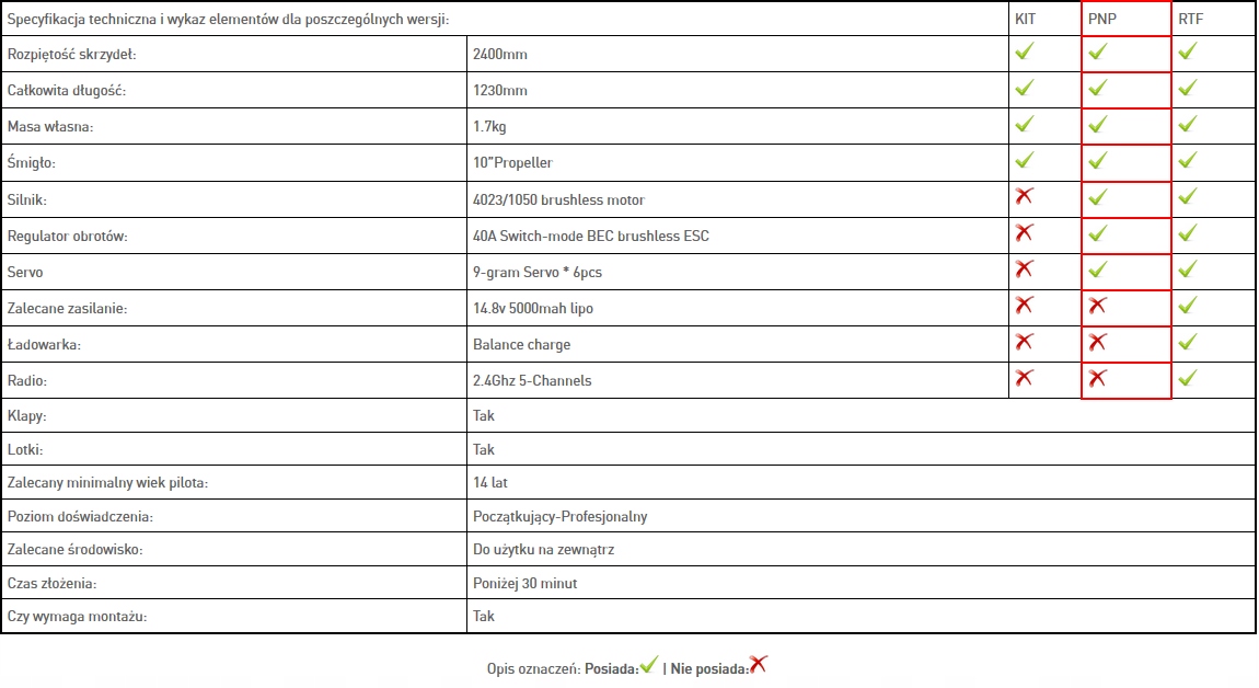 Глайдер у версії PNP, в комплект входить модель, двигун, регулятор і сервоприводи. Ви повинні придбати акумулятор, зарядний пристрій, передавач і приймач самостійно.