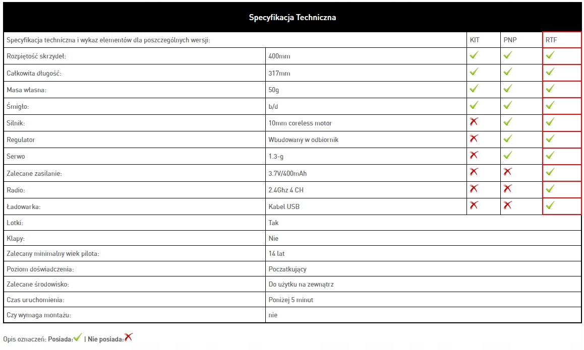 Версія літака RTF, модель містить усі елементи, необхідні для польоту, такі як двигун, регулятор, сервоприводи, акумулятор, зарядний пристрій, передавач і приймач. Щоб самостійно живити передавач, вам потрібно буде придбати 4 палички AA.