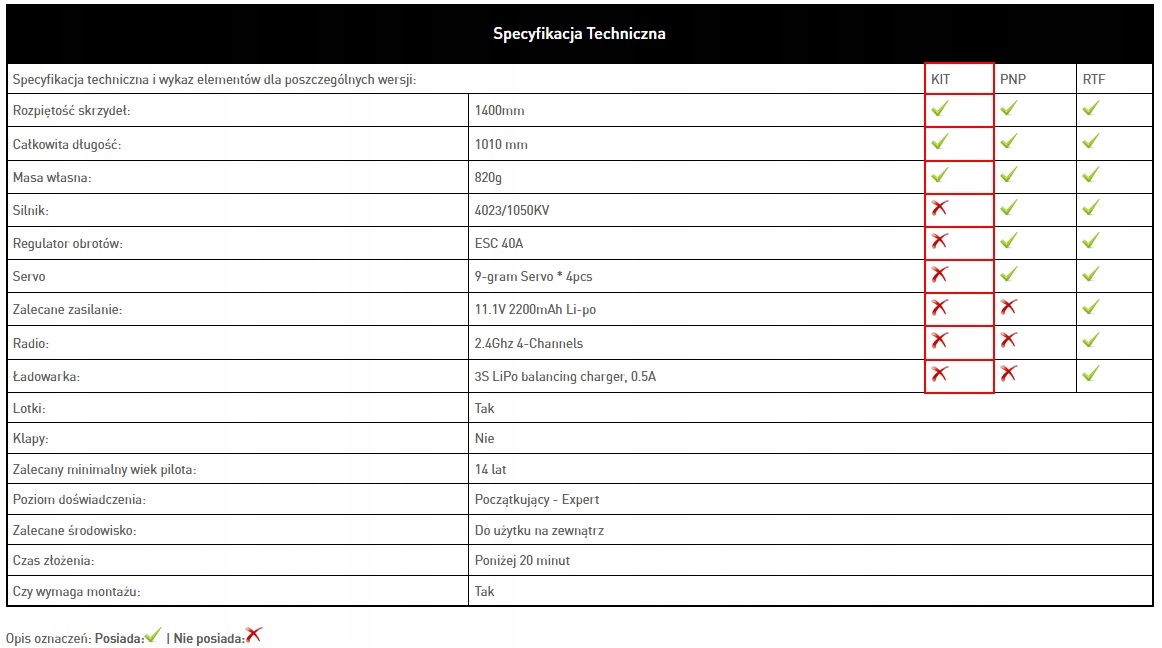 KIT версія літака, в набір входить сама модель. Ви повинні придбати двигун, контролер, сервоприводи, акумулятор, зарядний пристрій, передавач і приймач самостійно.