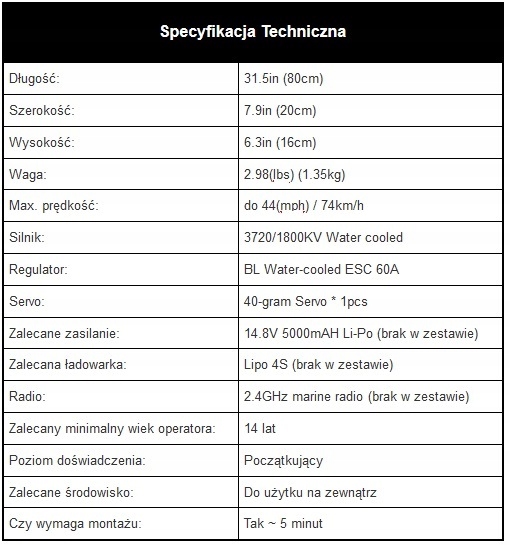 Човен у версії PNP, в комплект входить мотор, серво і регулятор. Ви повинні придбати акумулятор, зарядний пристрій, передавач і приймач самостійно.