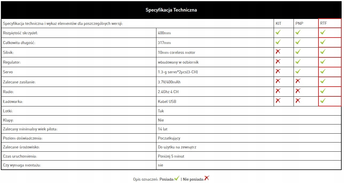 Літак у версії RTF, модель включає всі елементи, необхідні для польоту, такі як двигун, регулятор, сервоприводи, акумулятор, зарядний пристрій, передавач і приймач. Щоб самостійно живити передавач, вам потрібно буде придбати 4 палички AA.