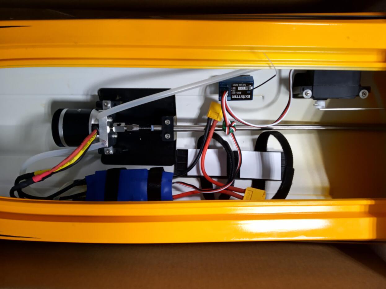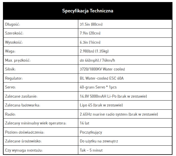 Човен у версії PNP, в комплект входить мотор, серво і регулятор. Ви повинні придбати акумулятор, зарядний пристрій, передавач і приймач самостійно.