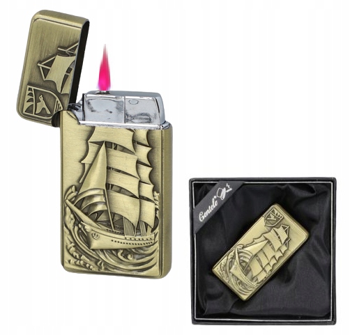 Запальничка з червоним полум'ям. Має кран для повторного заповнення газом і регулювання висоти полум'я. Упаковано в подарункову коробку.