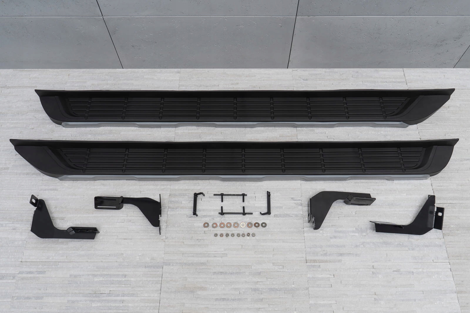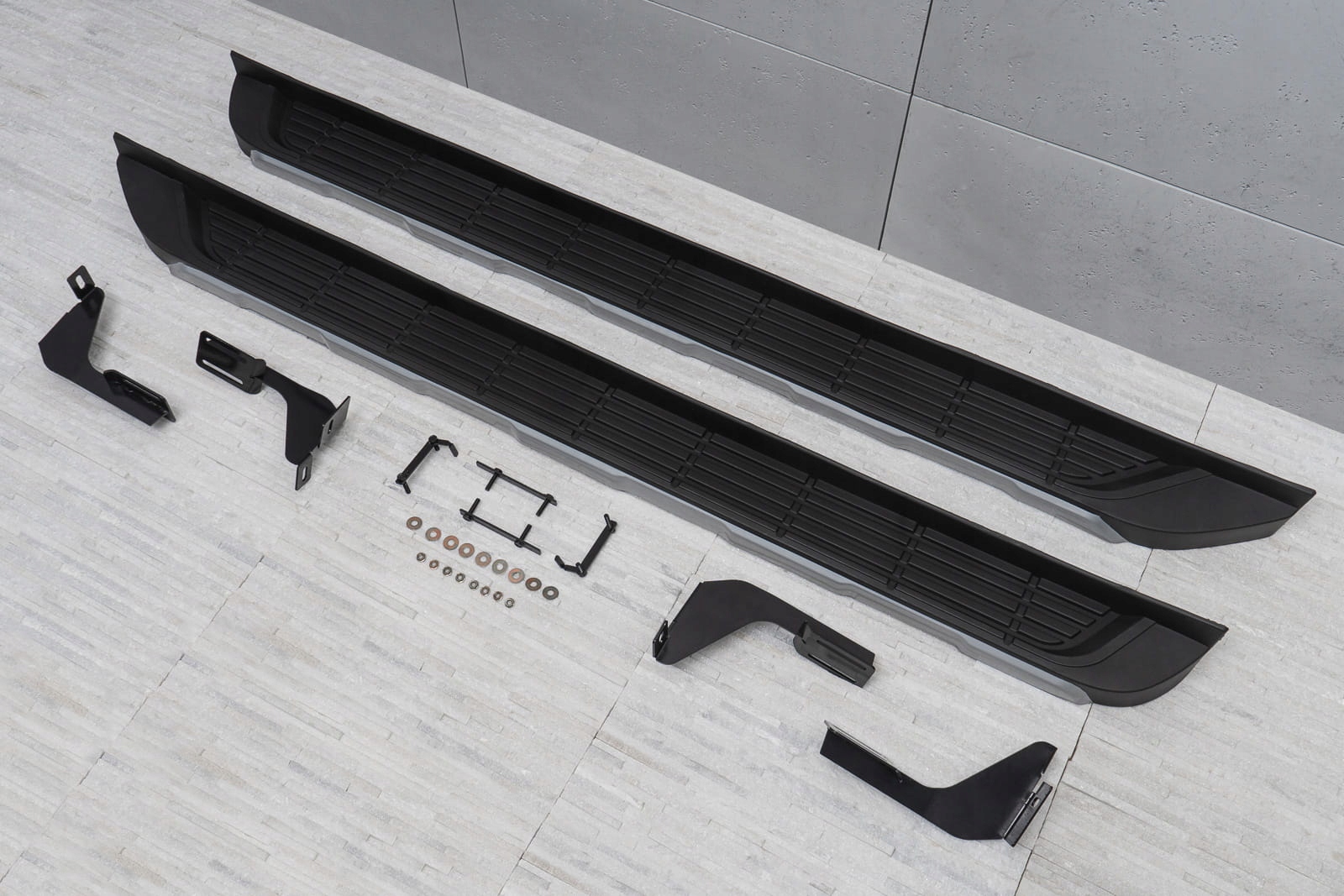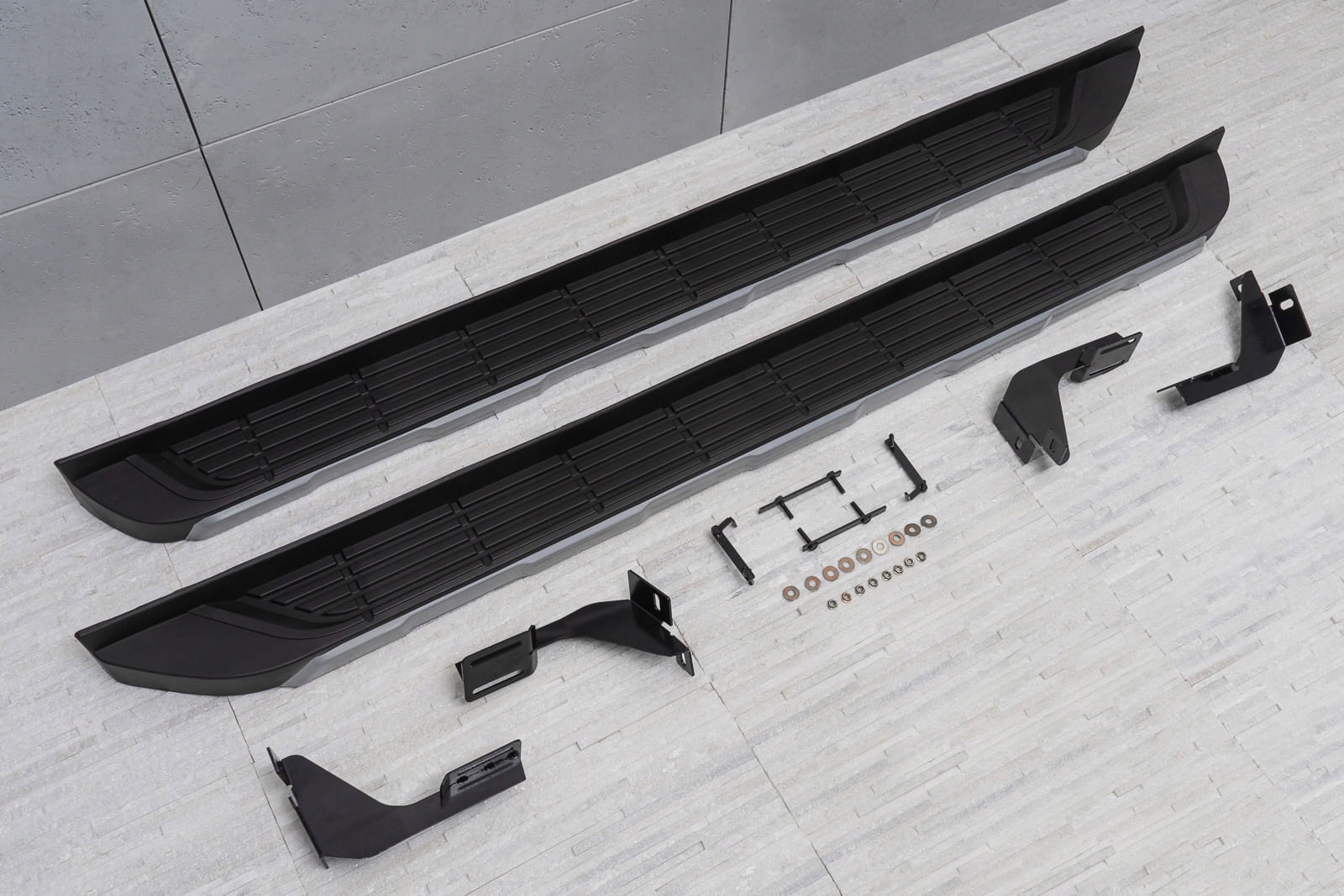 Встановлення підніжок не потребує свердління додаткових отворів, що дозволяє зберегти початковий вигляд. балів. монтаж і гарантує неінвазивне встановлення. У набір входить набір підніжок (права і ліва), елементи збірки та інструкція. Проте ми рекомендуємо професійну збірку в майстерні (з досвіду ми знаємо, що найкраще скористатися послугами фарбувальної або кузовної майстерні, тому що на цих заводах найчастіше встановлюють планки, бічні бортики та сходинки, тому збірка для цих заводів єінтуїтивно зрозумілою).