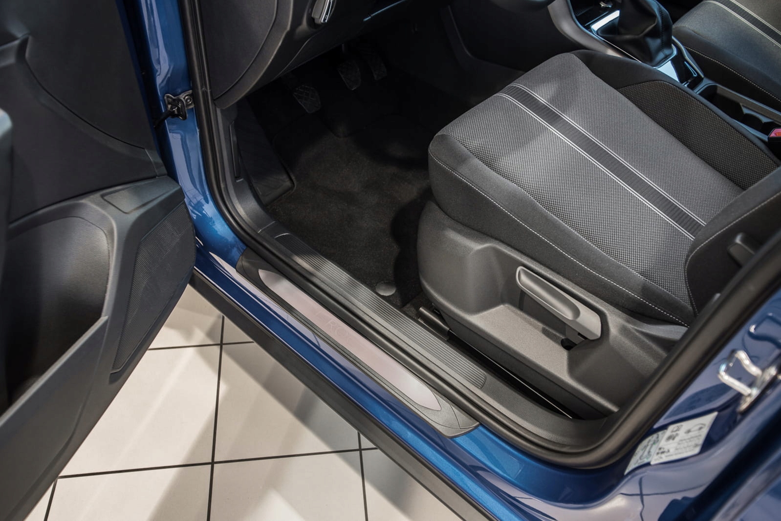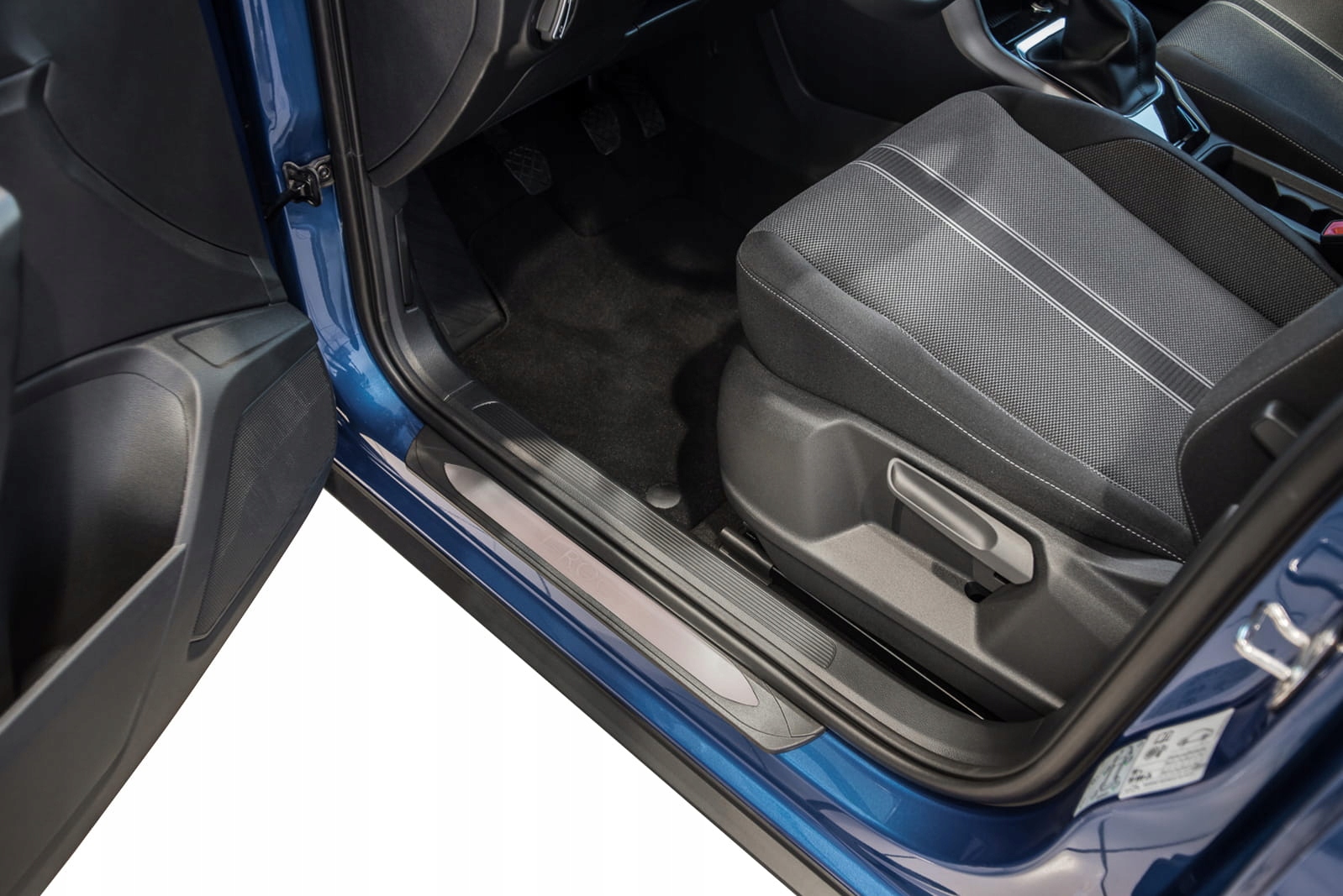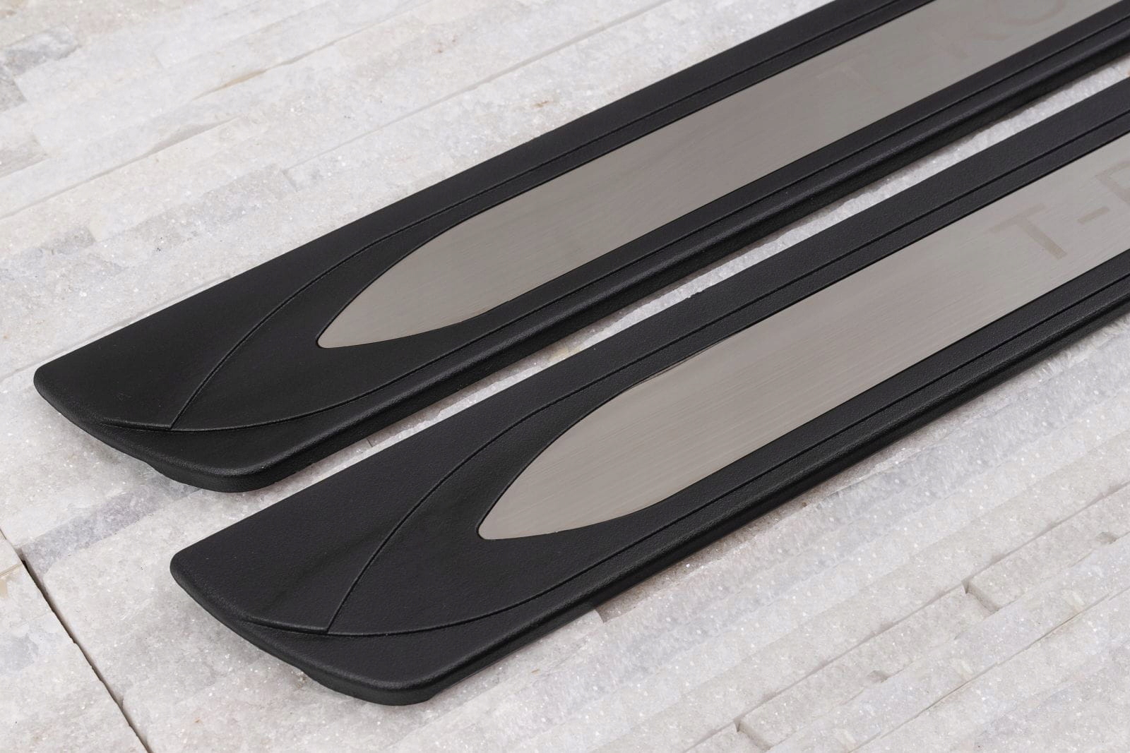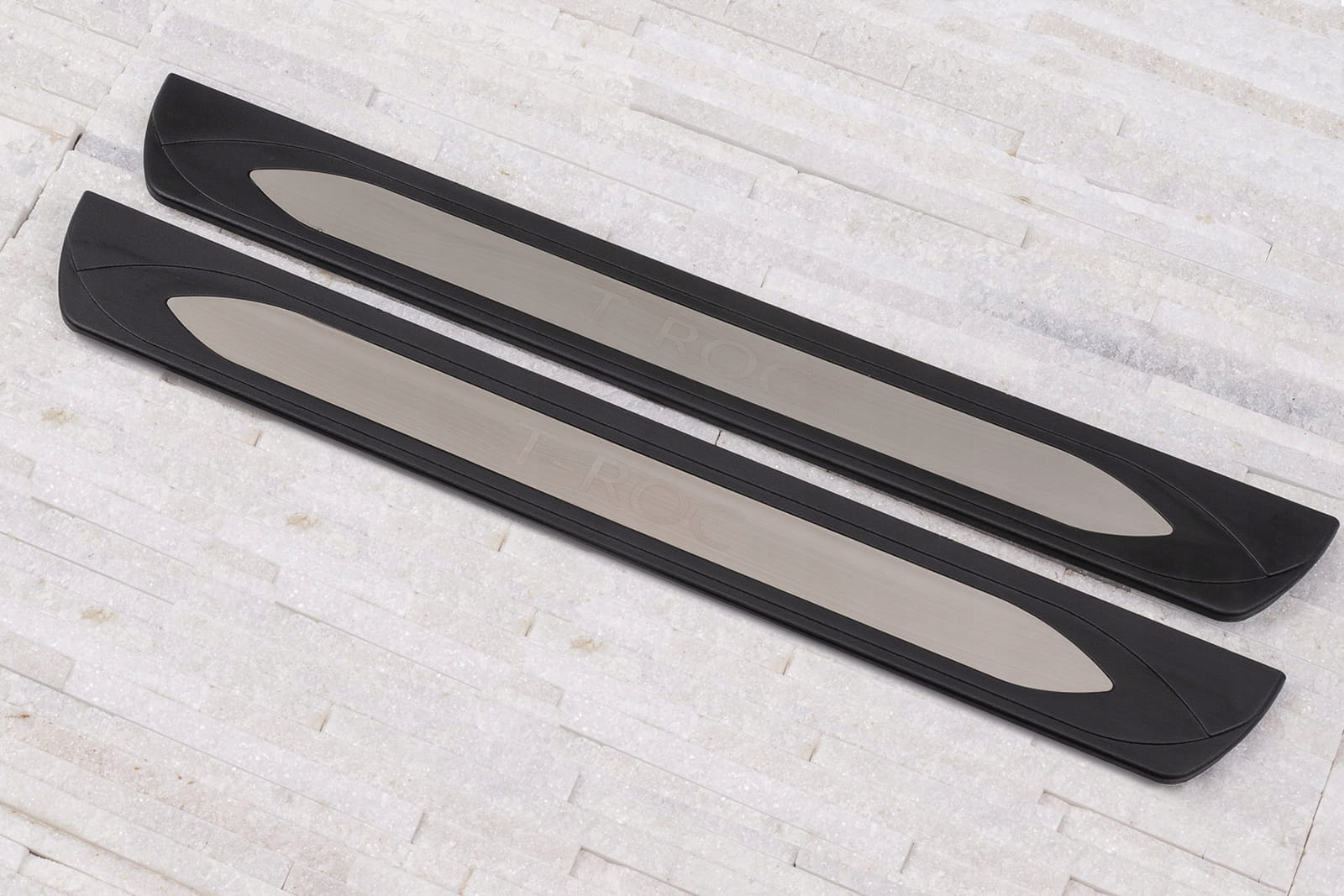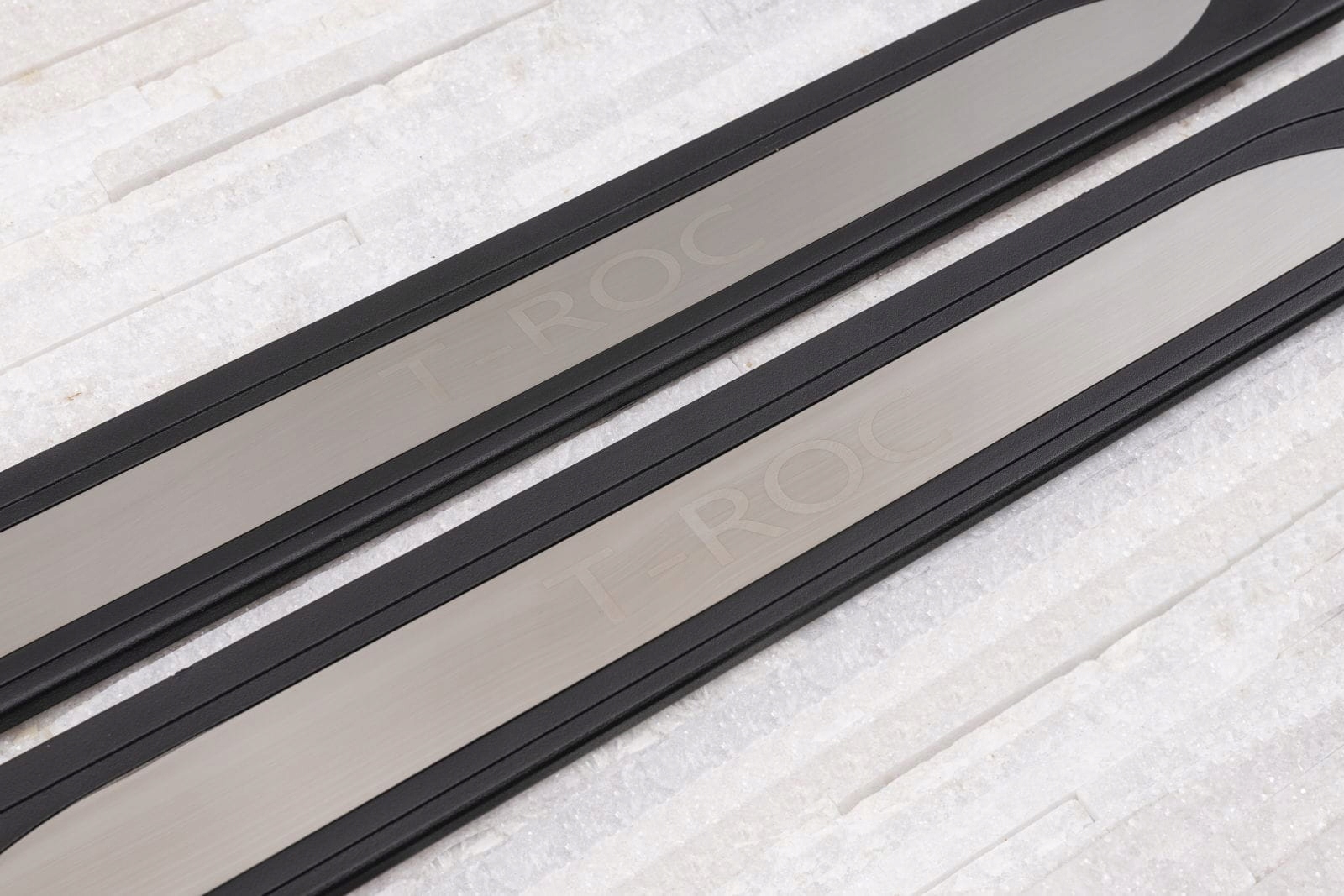 Планки кріпляться на пофарбовані частини внутрішніх порогів. Вони доповнюють внутрішню лінію дверей і надають поріжку спортивно-елегантний вигляд. Ця модель привертає увагу декоративним написом T-ROC, який видно в центрі кожної смужки.
