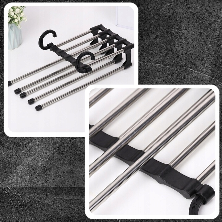 Висувні штани Вершник - це практичне Додавання до гардеробу, яке заощадить вам місце, а полегшить організацію одягу. Ця вішалка має місце для 5 пар штанів , завдяки якому ви можете легко помістити всі улюблені штани.