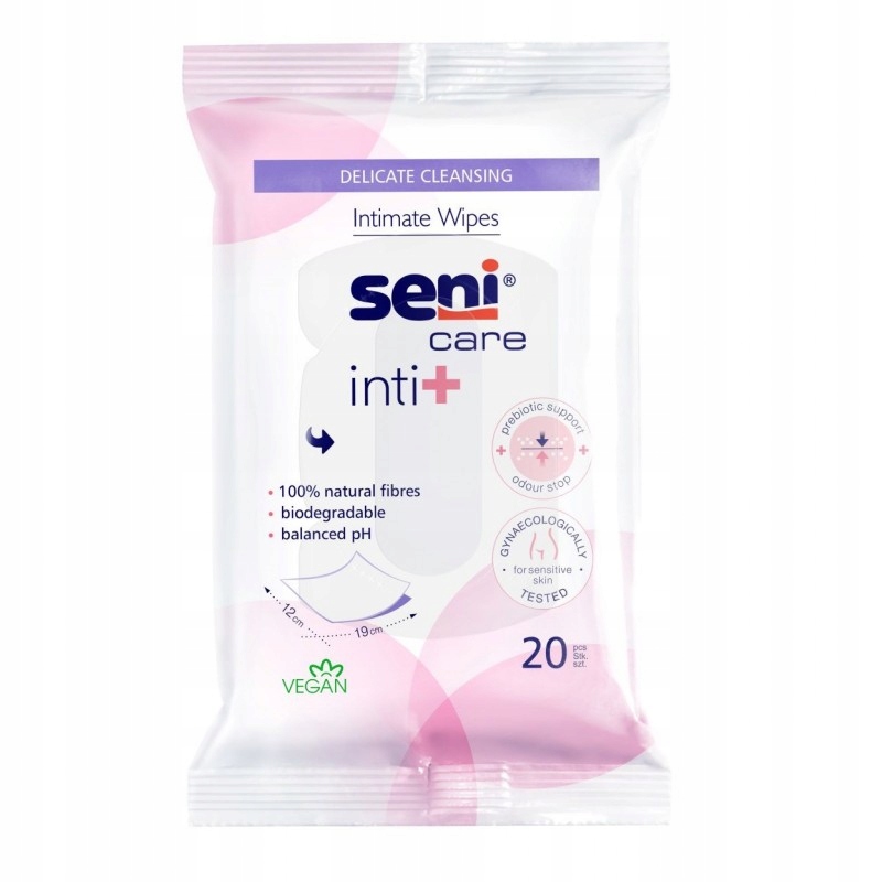 Серветки для інтимної гігієни Seni Care Inti+ створені для активних людей, які приділяють велику увагу належній гігієні інтимних зон. Серветки ефективно очищають, доглядають і заспокоюють подразнення. Вони нейтралізують неприємний запах сечі, тому рекомендовані як гігієнічний засіб для очищення чутливої шкіри, схильної до подразнення, у людей, які використовують урологічні прокладки. Вони ефективно зволожують і підвищують еластичність шкіри. Вони мають сприятливий для шкіри рН 5,5.