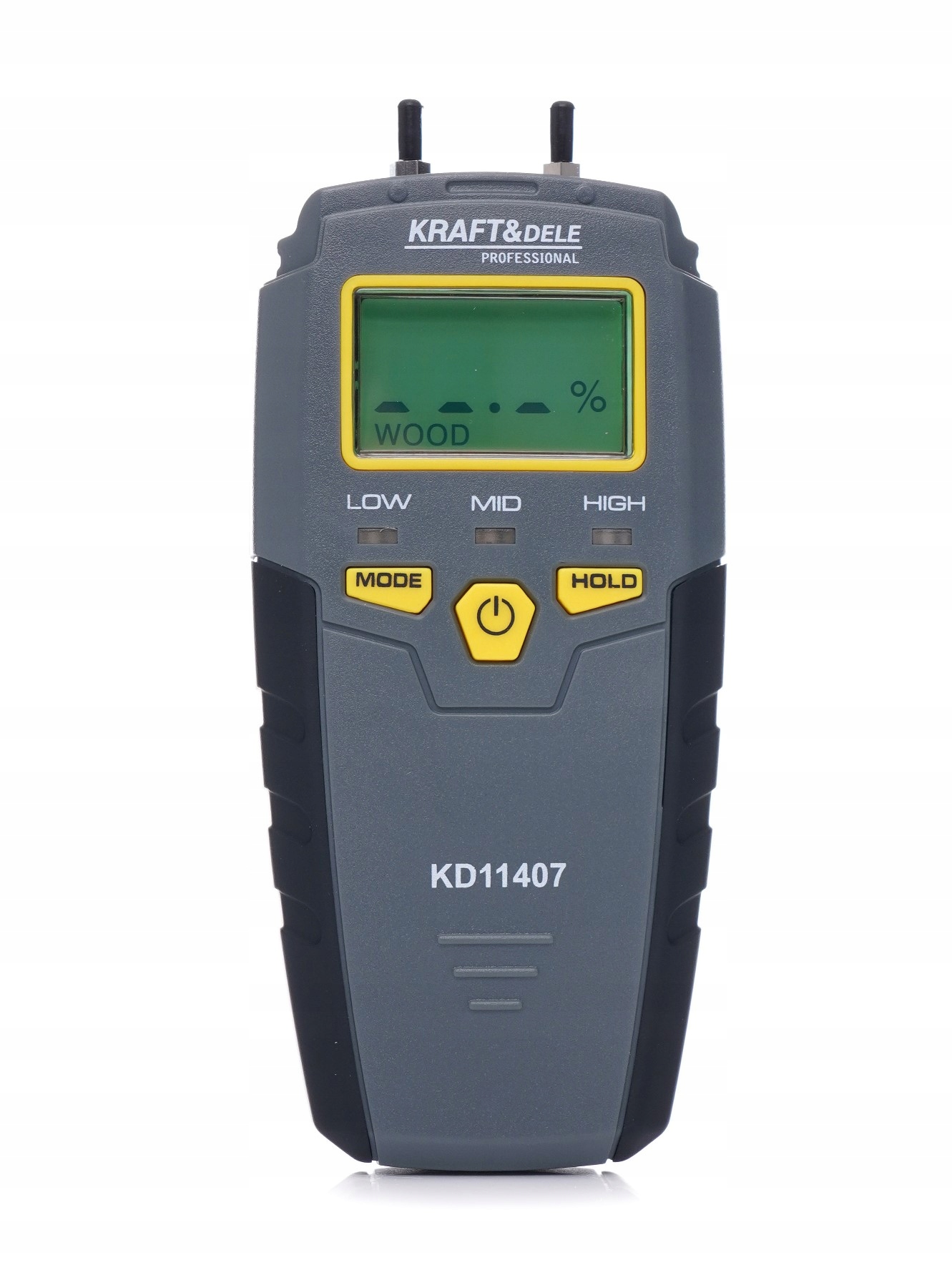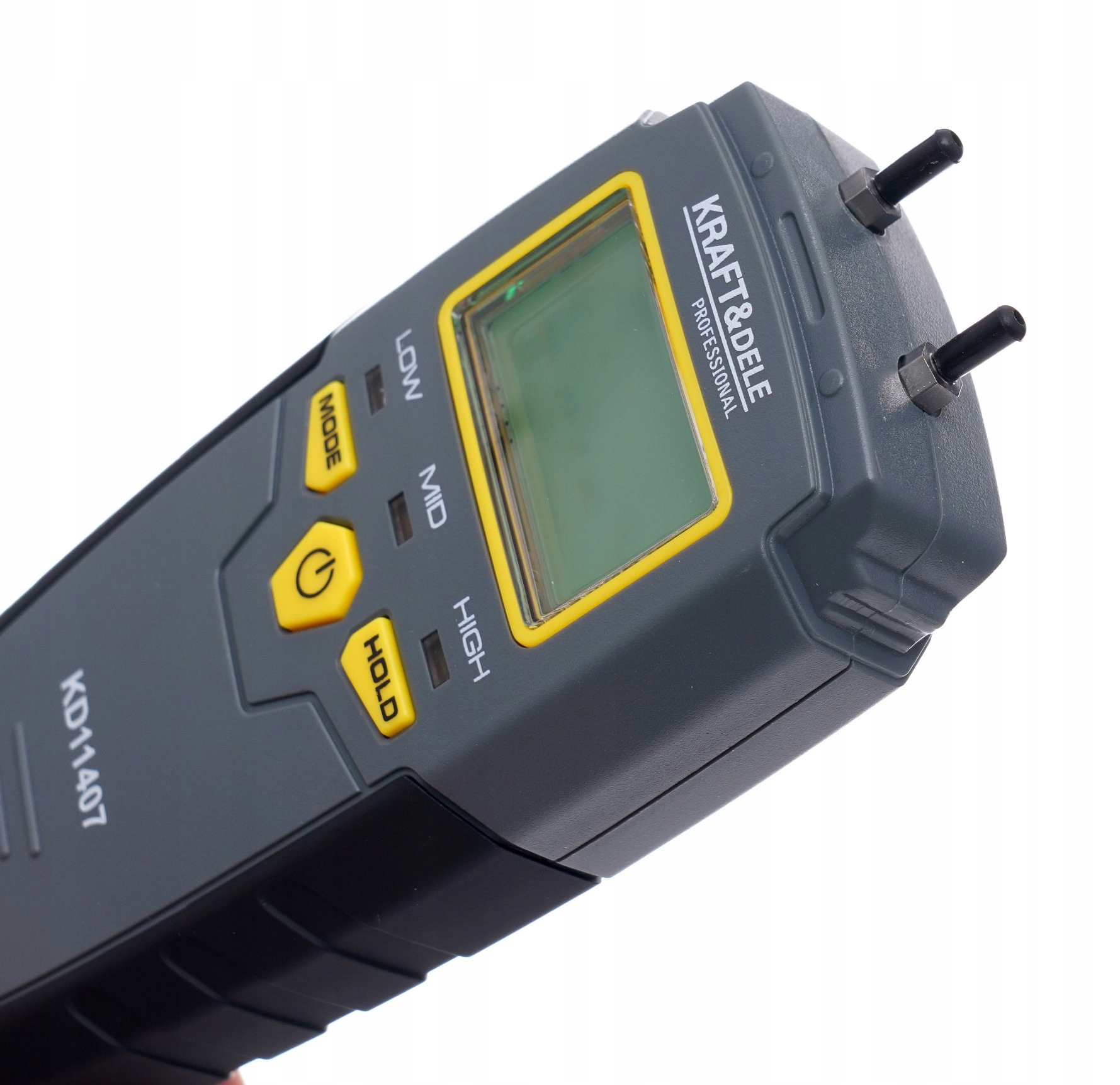 Вологомір Kraft&Dele, модель KD11407, вимірює вміст вологи шляхом визначення питомого електричного опору цільового матеріалу за допомогою двох контактів. Пристрій має інтелектуальний однокристальний дизайн з низьким енергоспоживанням, вміст вологи відображається на РК-дисплеї.