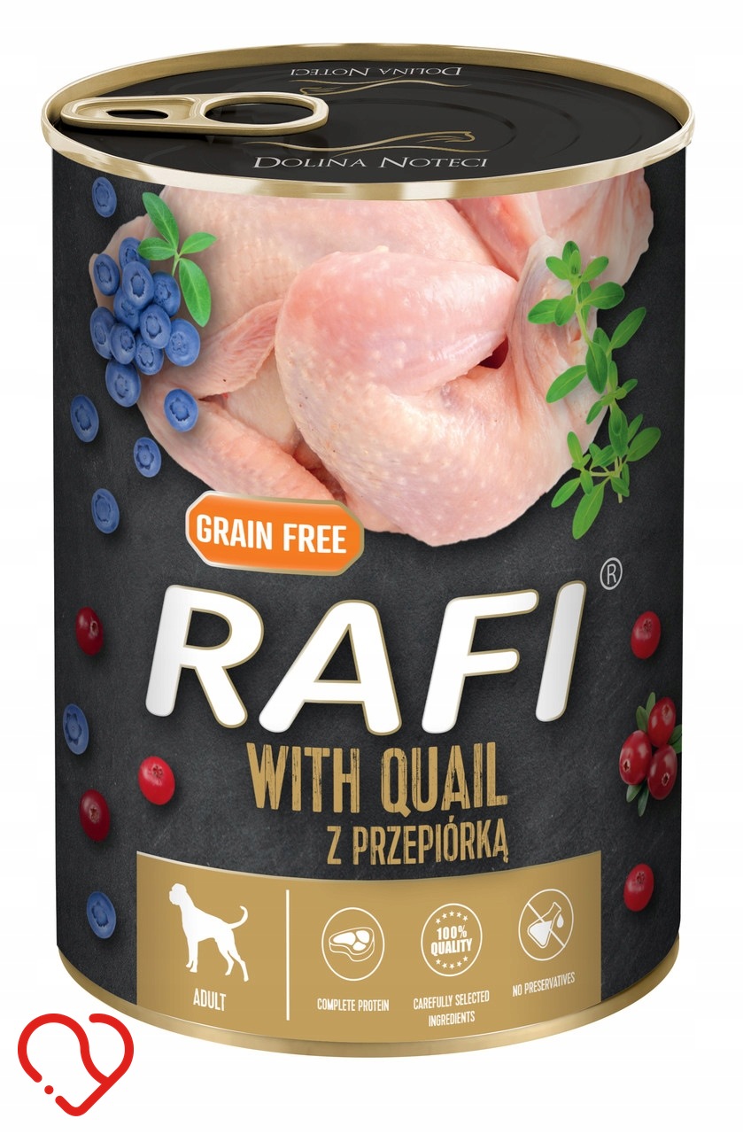 Що відрізняє вологий корм Rafi з перепелами, це високий вміст білка з багатим амінокислотним складом (фенілаланін і цистин). Перепелине м'ясо і сировина, особливо його жир, є джерелом цінних поліненасичених жирних кислот із сімейства n-6, які регулюють ряд функцій організму.