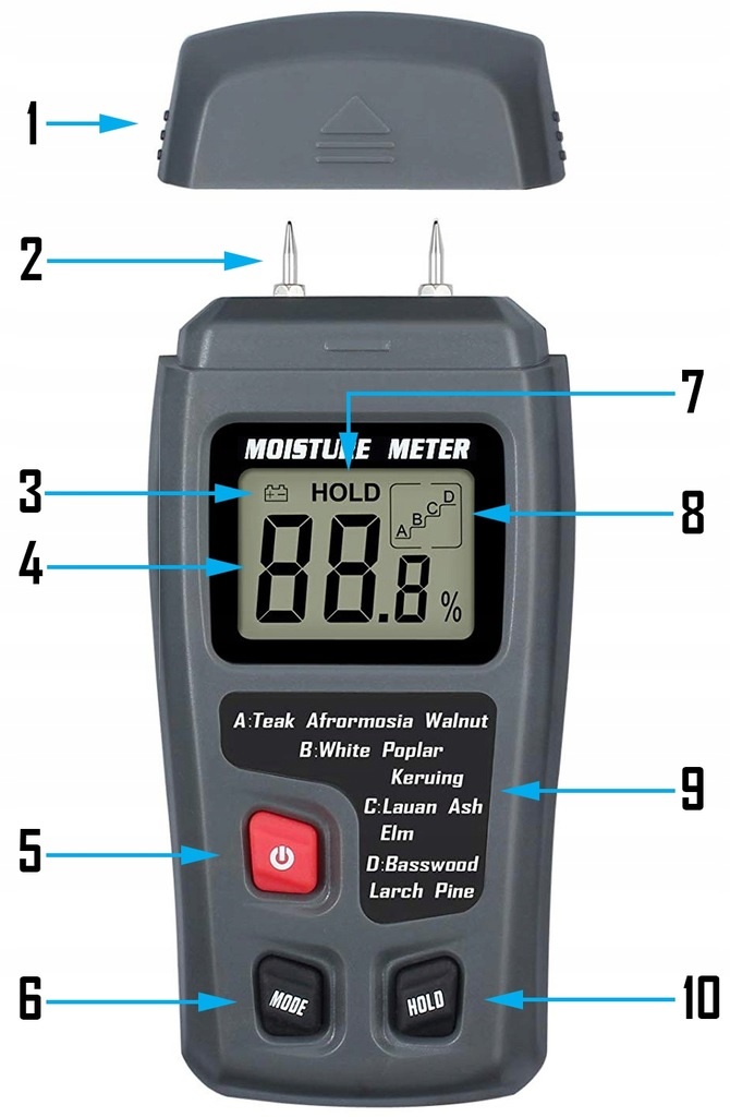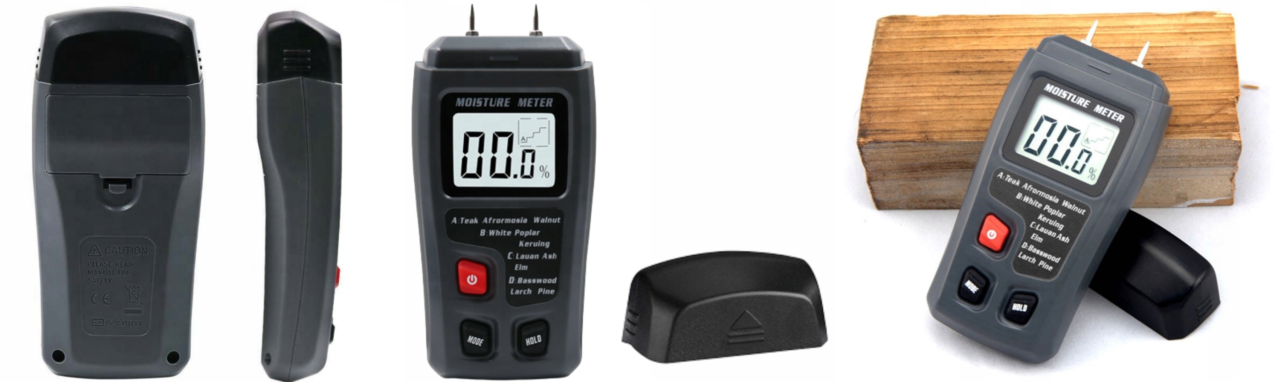 | ✅Цифровий дисплей | ✅Змінні групи деревини | ✅Висока точність вимірювань | ✅Автоматичне відключення через 15 хв | | ✅Компактний розмір |