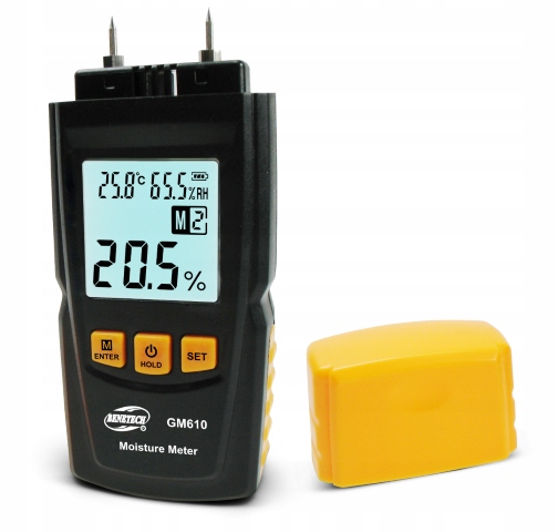 Компактний і міцний вимірювальний прилад для швидкого визначення вологості матеріалів - у дровах, пиломатеріалах, ДСП, шпоні, а також для паперу, лікарських рослин, бамбука та ін. тип матеріалів.