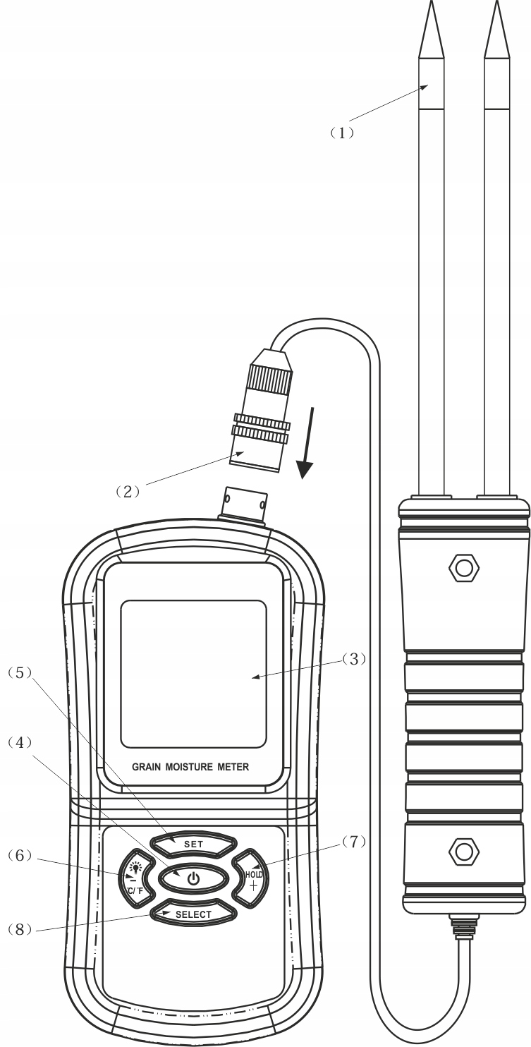 Вимірювання вологості в діапазоні від 5% до 30% і температури від -10 до 60° C. Для кожної з 8 програм було призначено певний тип зерна. Зібрані дані використовуватимуться закодованими перетворювачами, щоб надати вам найбільш реалістичний стан зерна, що перевіряється. Пристрій постачається з 2-контактним датчиком, який використовує перетворювач LSI, що забезпечує швидке й точне зчитування вимірювань.