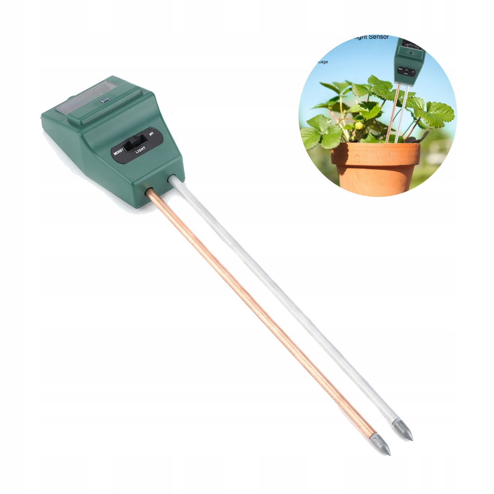 3 в ґрунтовому тестері 1: 1. Металевий лічильник - повідомляє, коли поливати для контролю вологості. Ви ніколи не будете поливати/поливати свої рослини надмірно. 2. РН -тестер - допомагає контролювати рівень pH у ґрунті, кислі або лужному, що підходить для ваших рослин. 3. Індикатор сонячного світла - допомагає визначити, чи отримує рослина правильного світла.