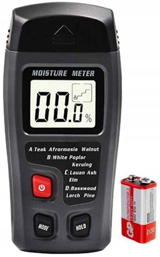 Чіткий дисплей показує поточну вологість досліджуваної деревини від 0 до 99,9%.