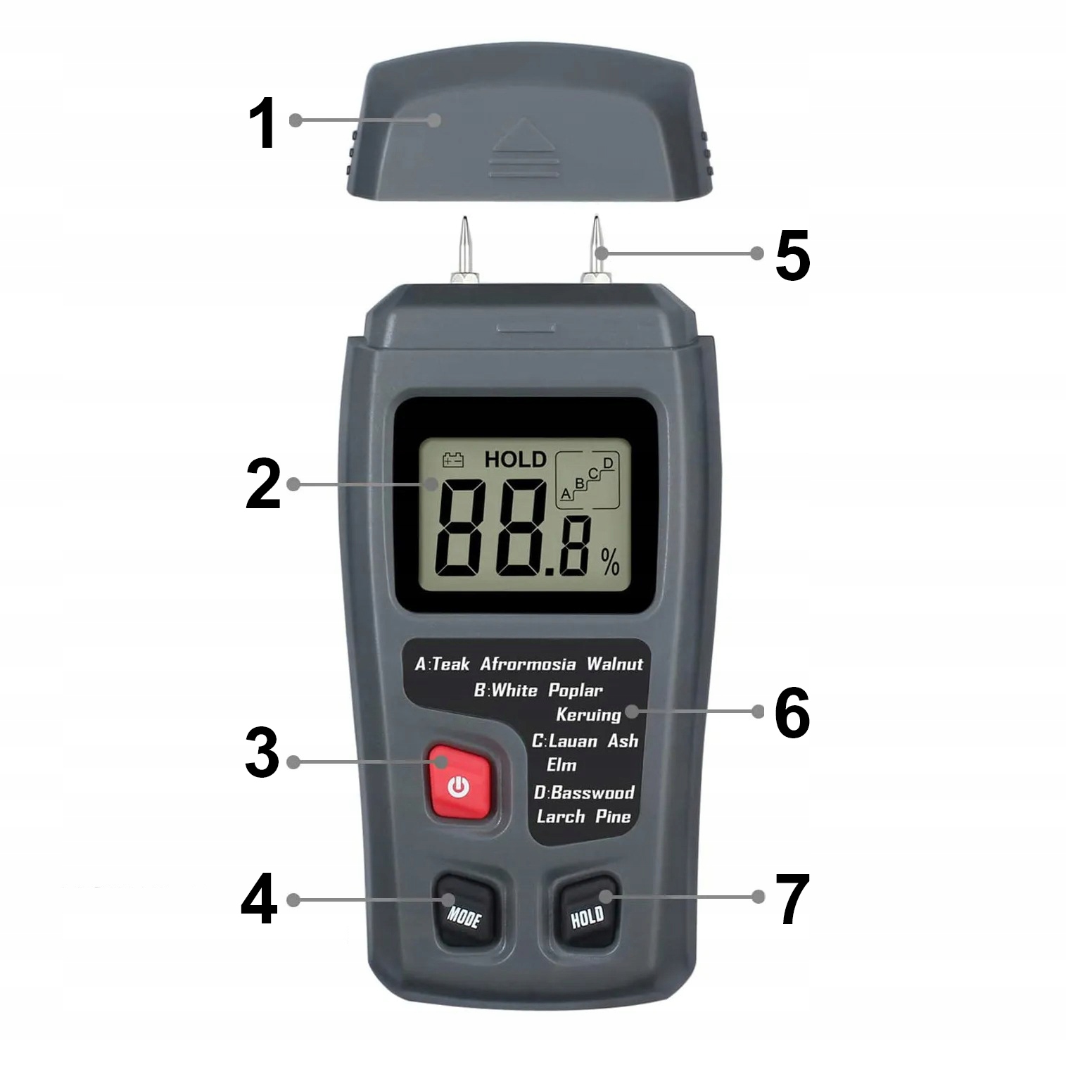 Цей пристрій використовує вимірювальні зонди, які слід вставляти в деревину, щоб точно визначити її вологість. Це дуже простий і швидкий метод вимірювання, який дає надійні результати.
