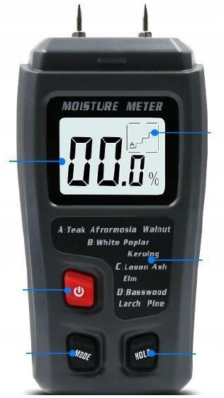 - Чіткий РК-дисплей показує рівень вологості деревини у відсотках по відношенню до вибраної породи дерева!