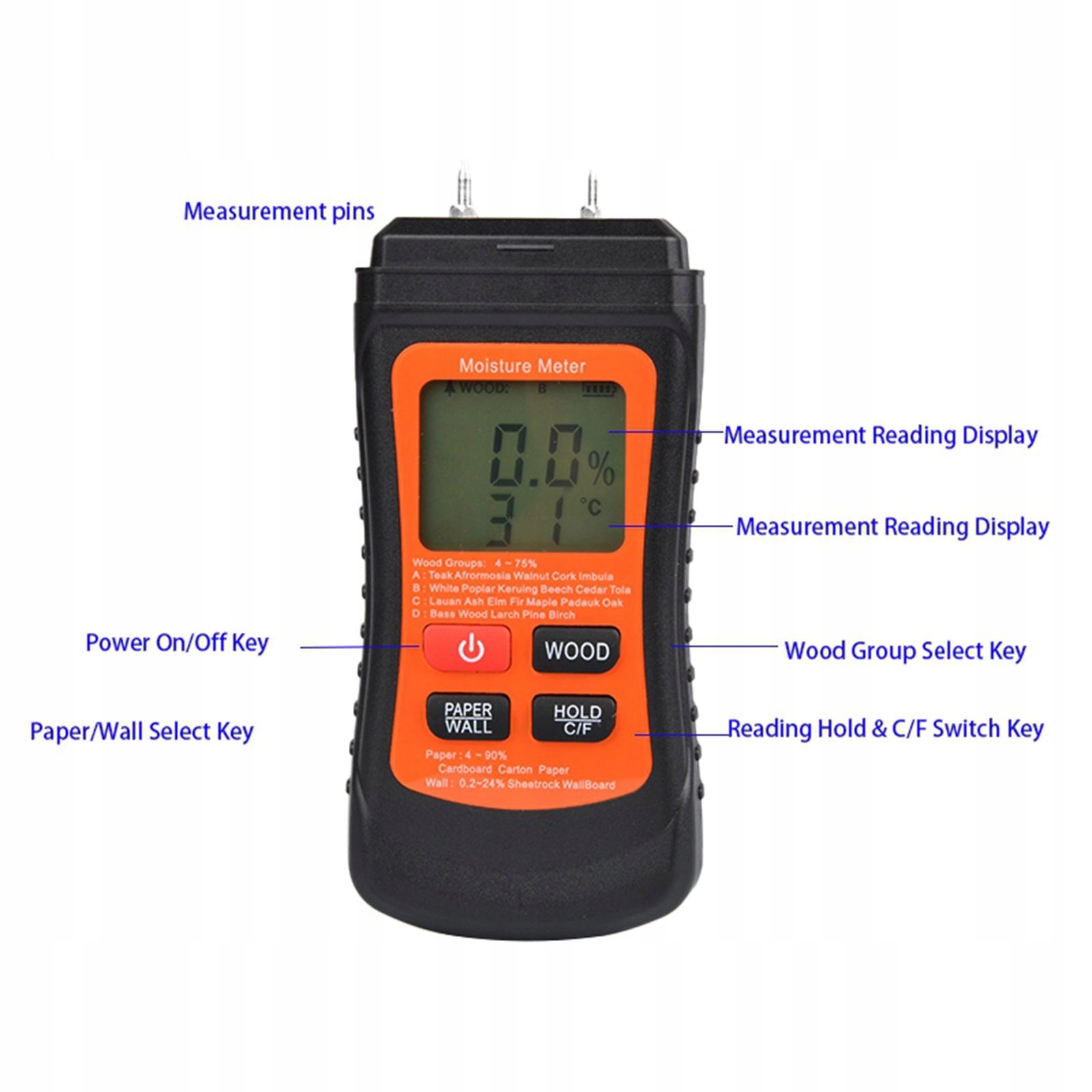 побудований - У чотирьох типах режимів з точними тестуваннями режимів, діапазоні вимірювання вологи: деревина 4-75%, папір 4-90%, стіна 0,2-24%; Діапазон вимірювання температури, роздільна здатність: 0,1%, точність: +/- 0,5%