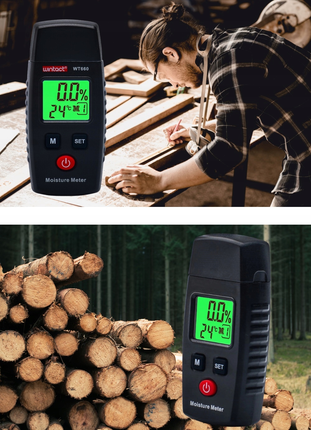 Компактний прилад поміститься в будь-якій кишені - ви завжди можете мати його з собою. Довговічний вимірювач для швидкого визначення вологості дерев'яних матеріалів, включаючи: дрова, пиломатеріали, ДСП, шпон, папір, лікарські рослини, бамбук. Він також підходить для вимірювання вологості будівельних матеріалів, таких як: цементні розчини, вапняні розчини, цегла тощо.