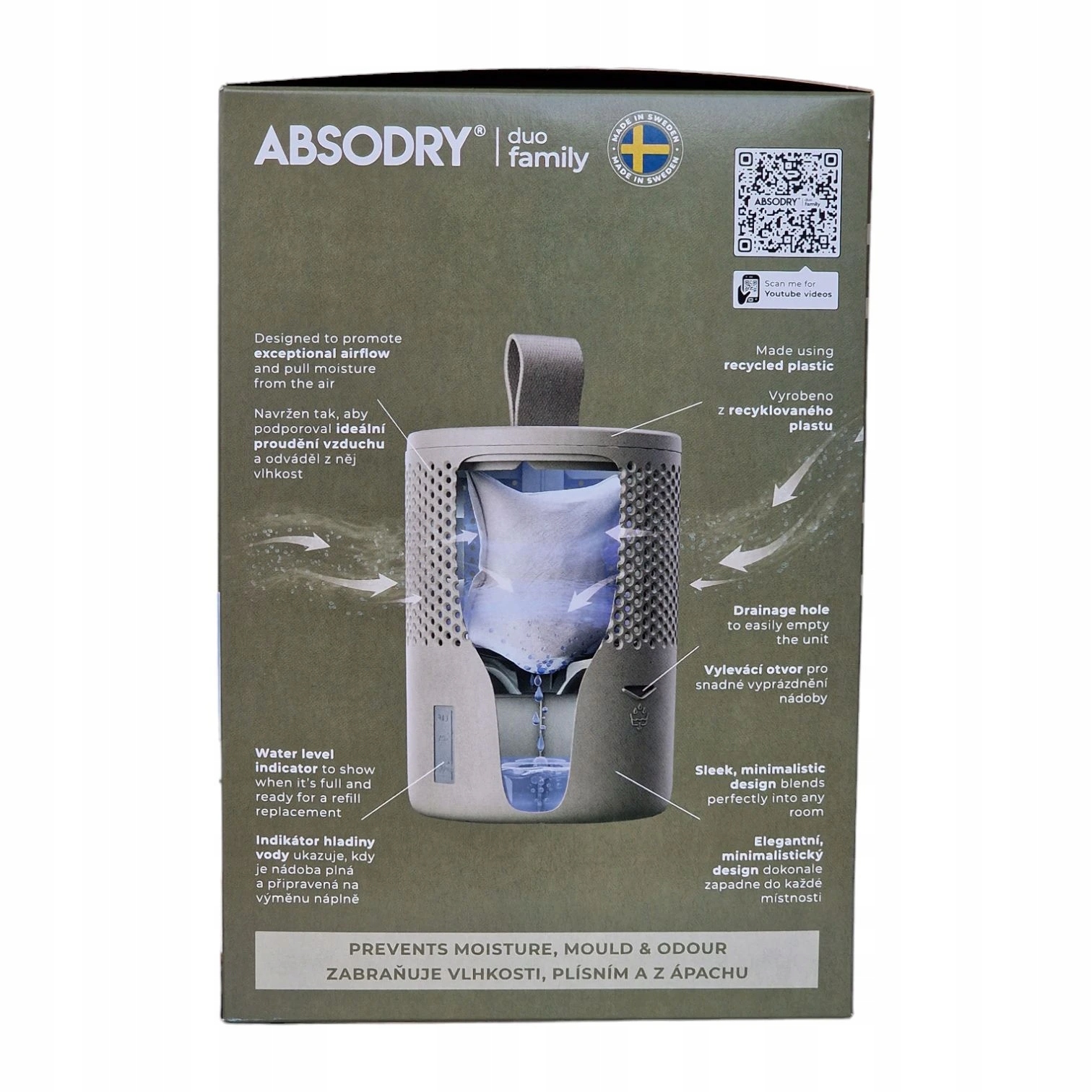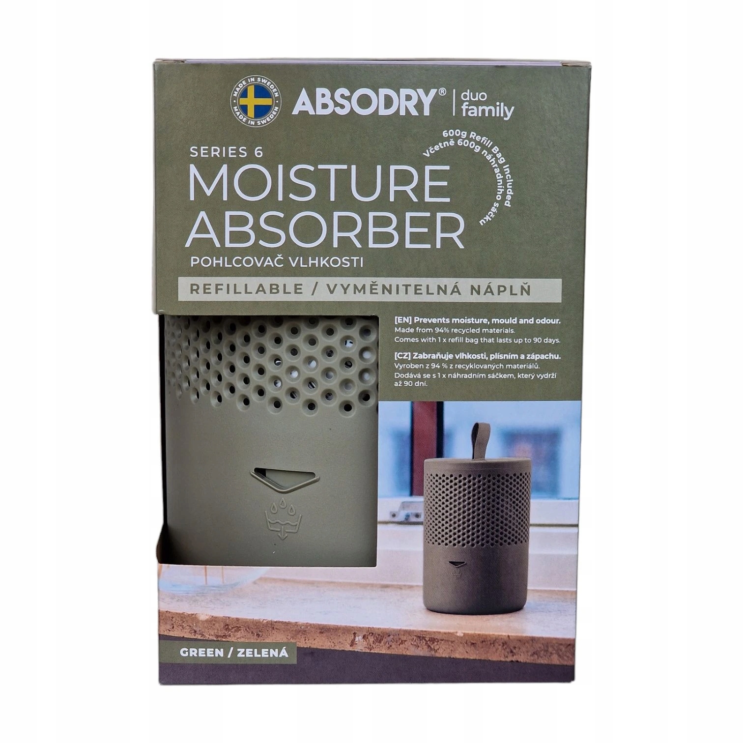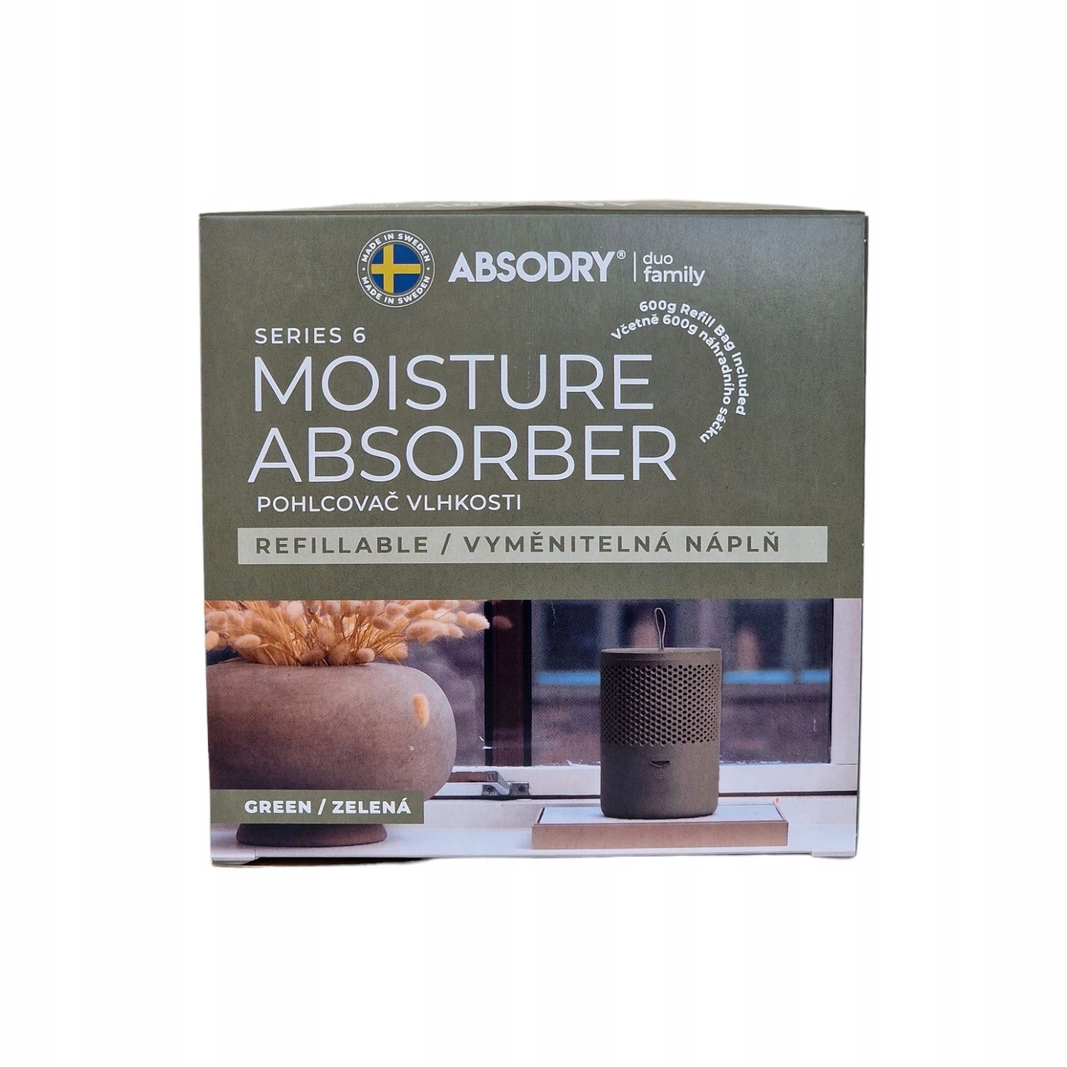 Високоякісні та міцні матеріали є невід’ємним елементом усіх функціональних аксесуарів у вашому домі. Конструкція абсорбера розроблена таким чином, що його можна розмістити в будь-якому місці інтер'єру і при цьому не порушити його зовнішній вигляд. Щоб ідеально відповідати простору для поглинача вологи Absodry Duo Family, ви можете вибрати один із 4 відтінків кольорів.