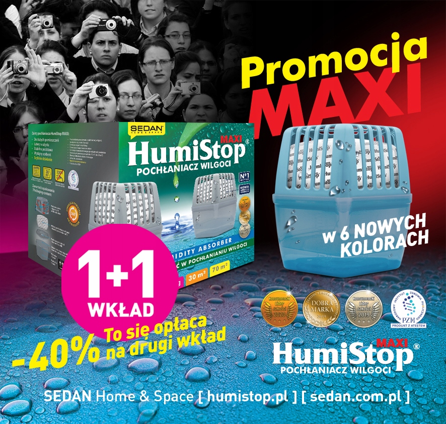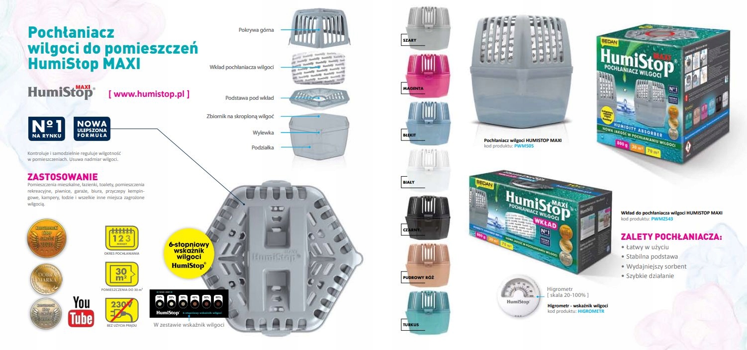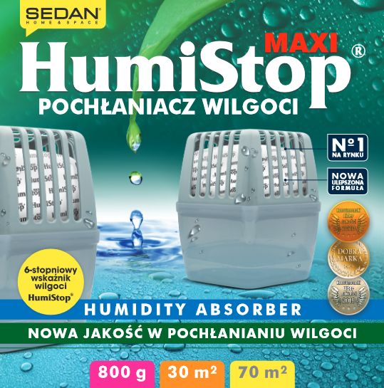 HumiStop® MAXI в новій версії! Відтепер вологопоглиначі HumiStop® Maxi доступні в таких кольорах: білий, блакитний, чорний, пурпурний, пудрово-рожевий, сірий, бірюзовий. Форма та ефективність пристрою залишилися незмінними, а завдяки багатьом кольоровим версіям новий HumiStop® Maxi чудово виглядає на полиці.