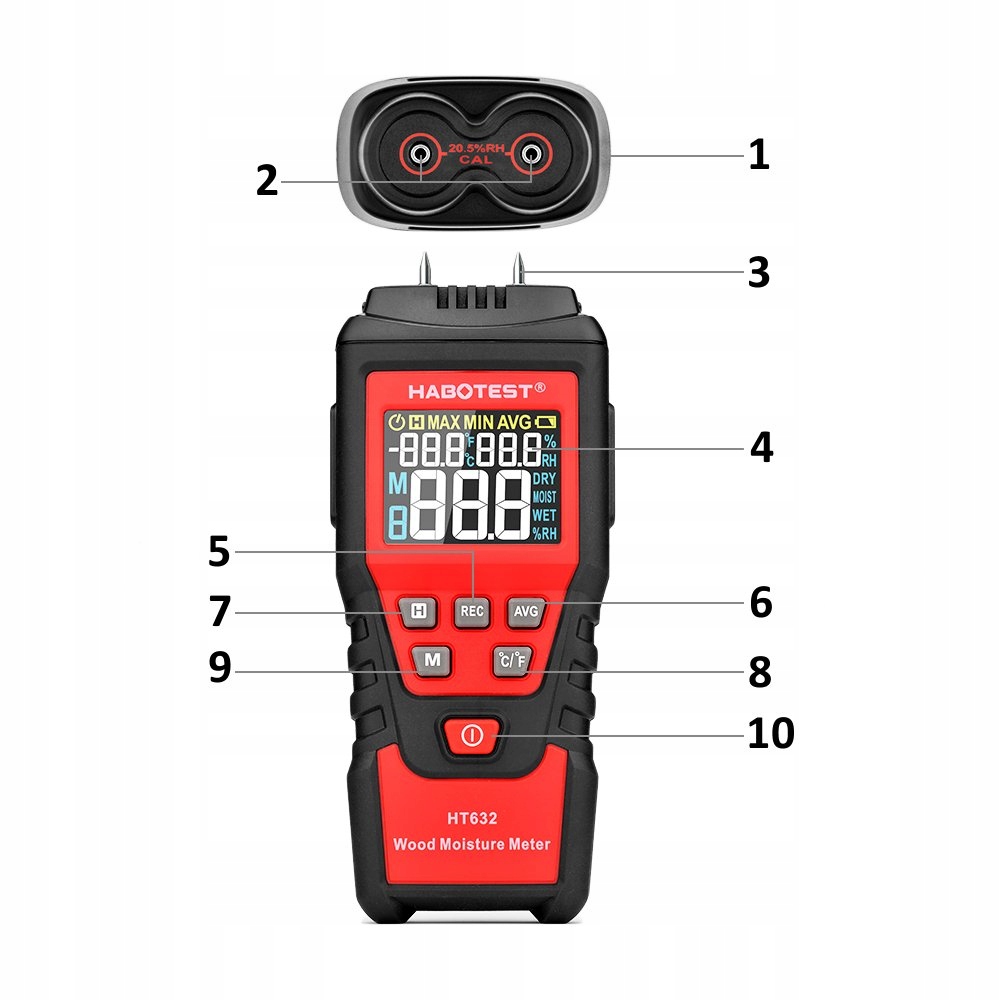 Лічильник Habotest HT632 дозволяє вимірювати як вологість, так і температуру навколишнього середовища. Він оснащений 7 режимами вимірювання, які можна вибрати залежно від типу деревини чи матеріалу. Крім того, він дозволяє змінювати одиниці вимірювання °C/°F і автоматично вимикається після певного періоду невикористання для економії енергії (цю функцію можна вимкнути).