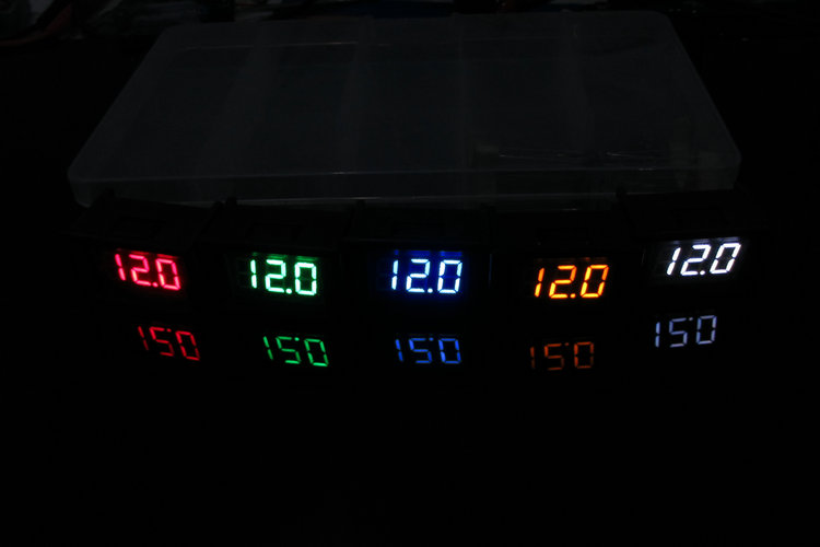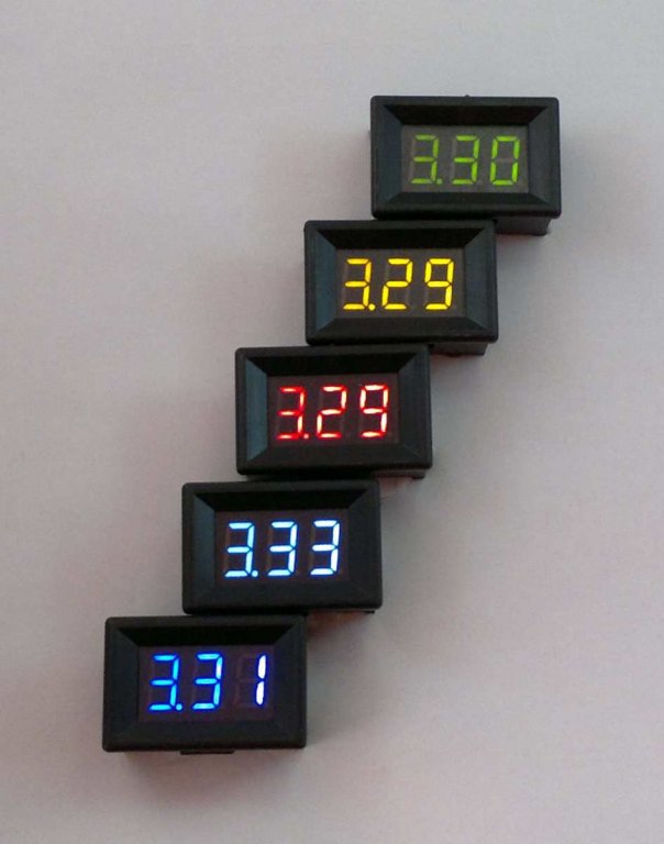 Малі розміри та низька робоча напруга дозволяють використовувати вимірювач у системах із живленням від батарей (Li-Ion, LiFePo, 2xAA). На фотографіях показано порівняння з популярною моделлю 3x0,56'' і властивості, близькі до нижньої межі вимірювання. Нижче 3,8 В дисплей трохи темніє (див. фото). Червоні дисплеї зберігають найвищу яскравість до кінця нижнього діапазону вимірювань. У діапазоні 4-28 В усі кольори зберігають однакову яскравість, крім зеленого, який трохи темніший p>