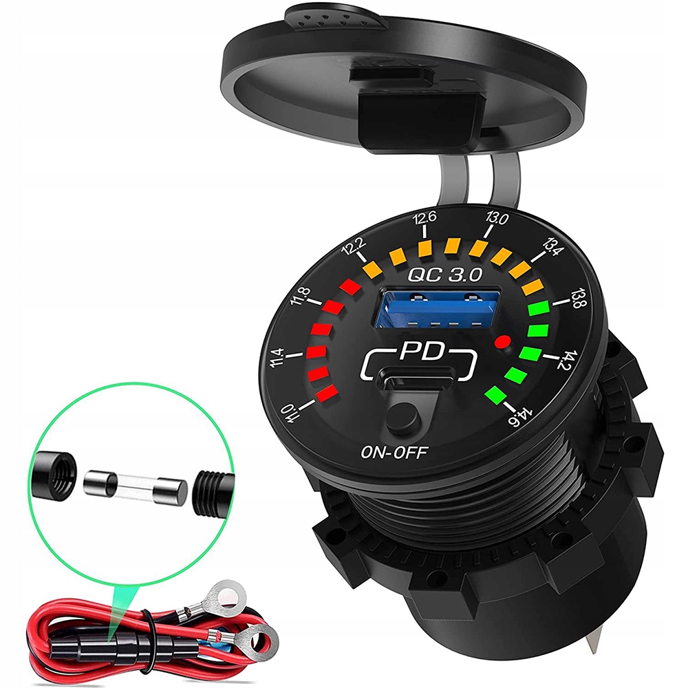 Зарядний пристрій для мотоцикла 2x QC3.0 + ВОЛЬТМЕТР + кнопка: