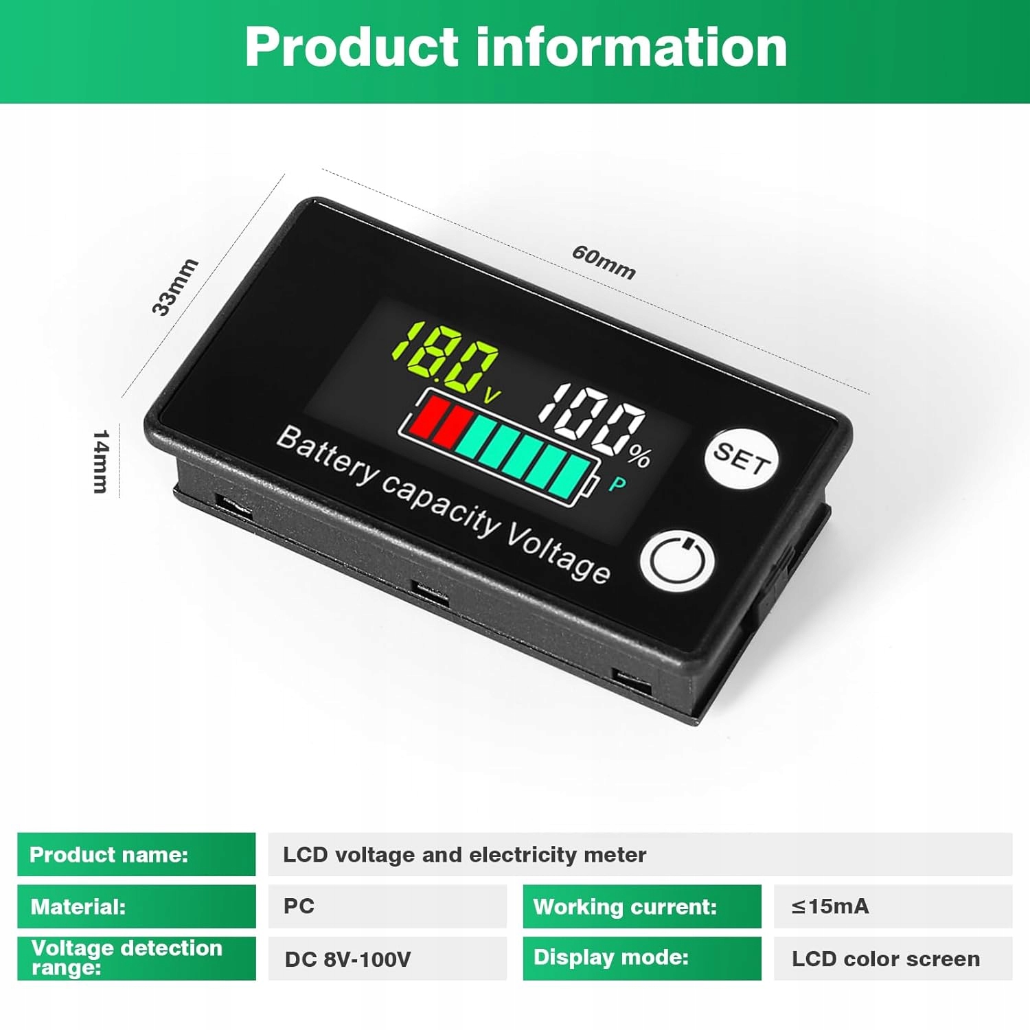 Відповідні типи Монітор вольтметра ємності батареї підходить для потрійних літієвих батарей DC8100V 12V 24V 36V 48V 60V 72V свинцево-кислотних батарей і літій-залізо-фосфатних батарей. Функція сигналізації про низьку напругу Монітор ємності батареї може встановити звуковий сигнал і змінити напругу коротким натисканням кнопки. Кольоровий РК-дисплей Моніторинг напруги та потужності незалежно від того, під яким кутом ви дивитеся, ємність, напруга та відсоток заряду батареї можуть чітко відображатися на РК-екрані, що полегшує моніторинг заряду батареї. Функція Тестер ємності батареї має кілька засобів захисту, таких як захист від зворотного входу, пам'ять про завершення роботи, сигналізацію низької напруги та дисплей синхронізації. Широкий діапазон застосування. РК-вимірювач напруги та електроенергії підходить для визначення напруги та струму акумулятора мотоциклів, автомобілів і човнів.