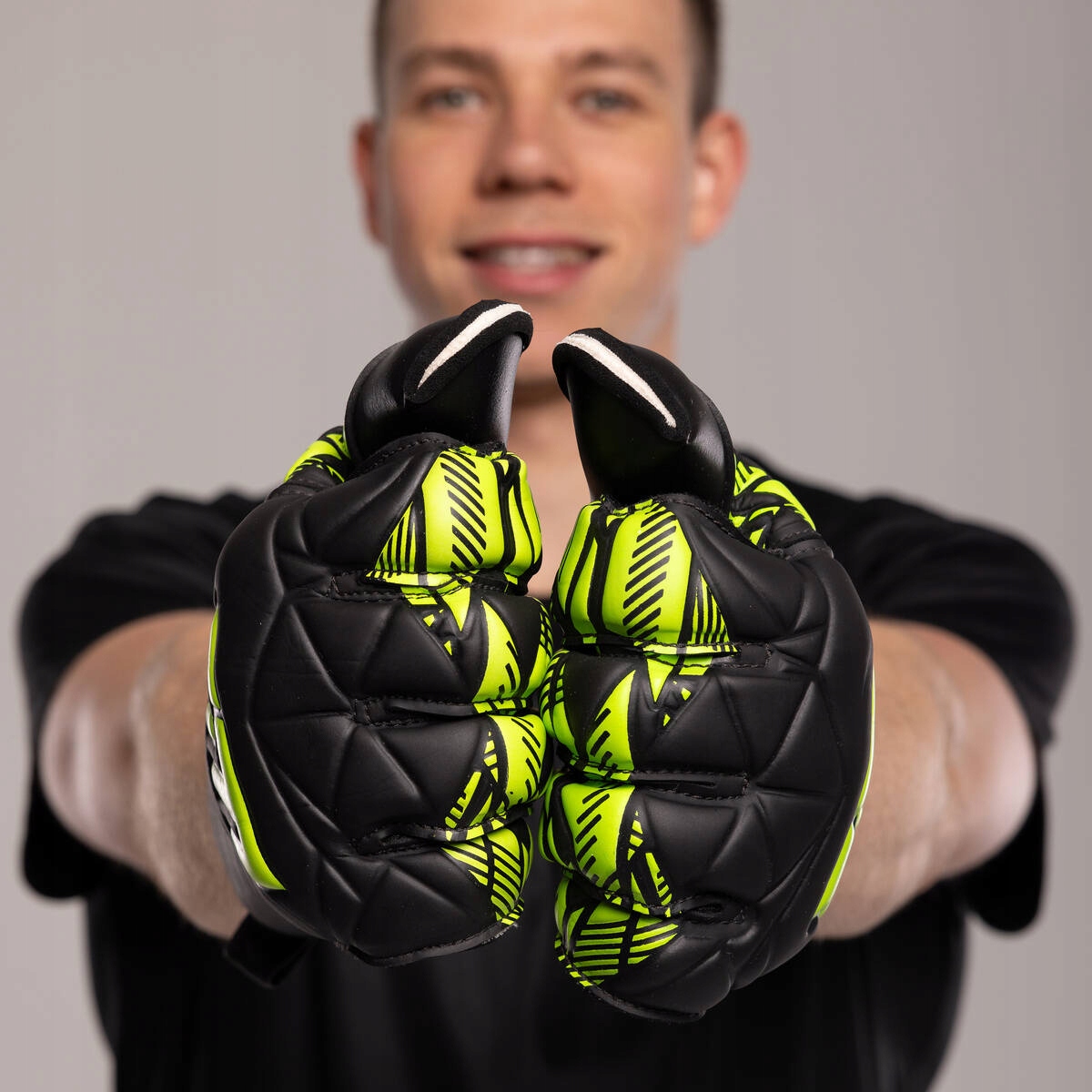 - Розріз Roll Finger + гарантує максимальний контроль над м’ячем. Заокруглені пальці збільшують поверхню контакту з м’ячем, а відсутність швів на двох середніх пальцях подвоює довговічність рукавичок.