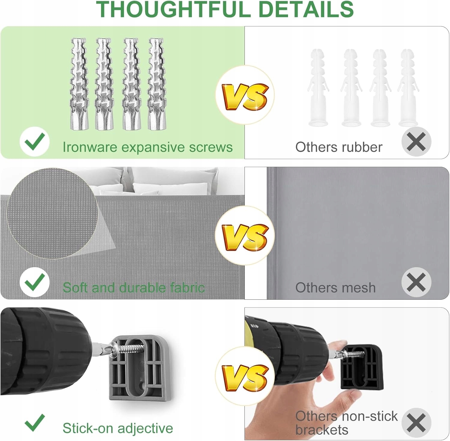 М'яка і міцна конструкція: виготовлена з ПВХ -матеріалу, який є екологічно чистим і має міцну конструкцію завдяки сильній і м'якій сітці, щоб запобігти дитині, навіть якщо вона випадково потрапить у двері. Крім того, його легко чистити та мити. Список частини цієї воріт також включає міцні апаратні гвинти та гвинти розширення.