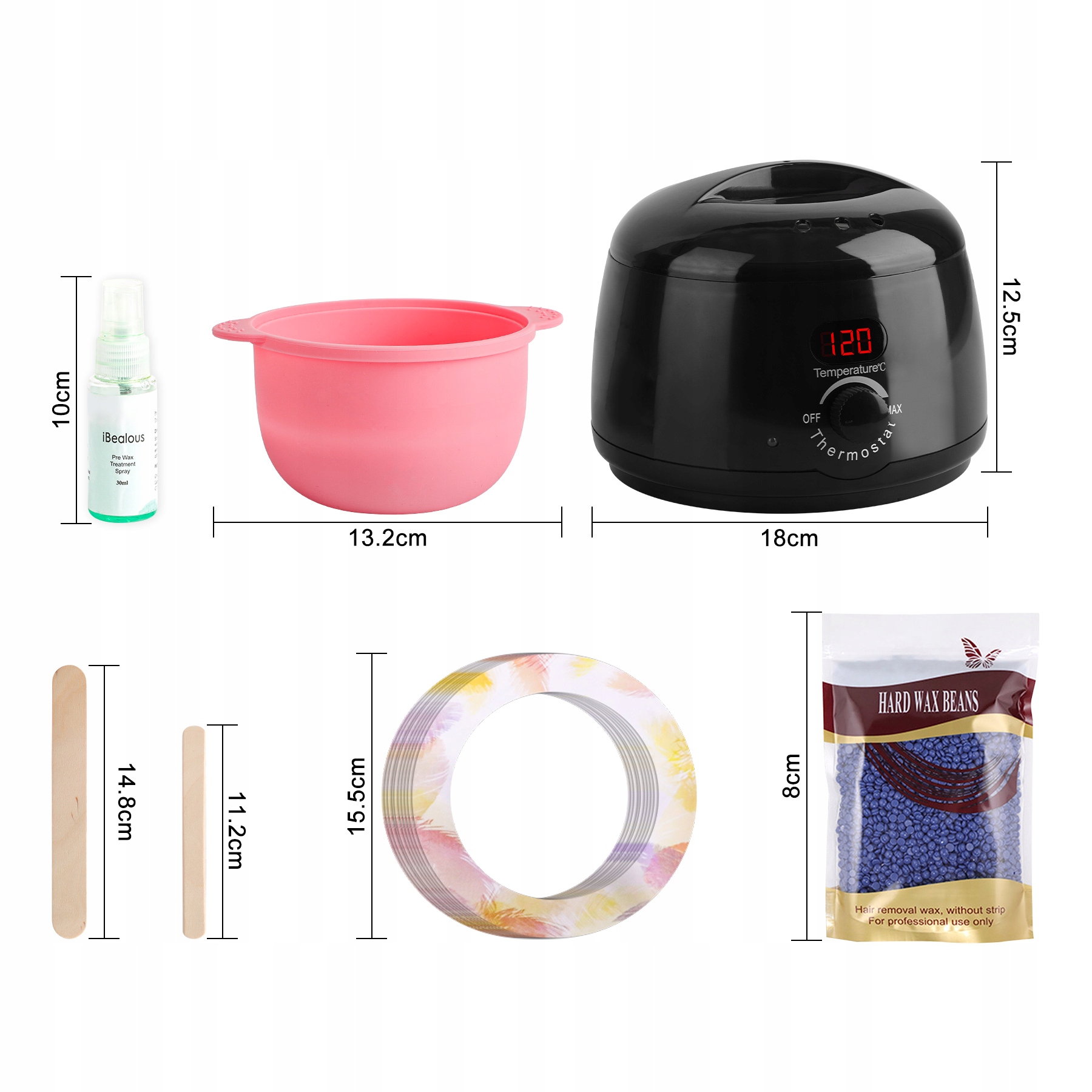 Набір включає 1 500 мл цифровий воскоплав, 1 знімний алюмінієвий контейнер, 1 силіконовий лоток, 5 упаковок воскових зерен (по 100 г кожна), 30 дерев’яних аплікаторів для тіла та брів, 10 кілець проти плям, 2 розпилювачі (30 мл). кожен) для підготовки та заспокоєння шкіри.