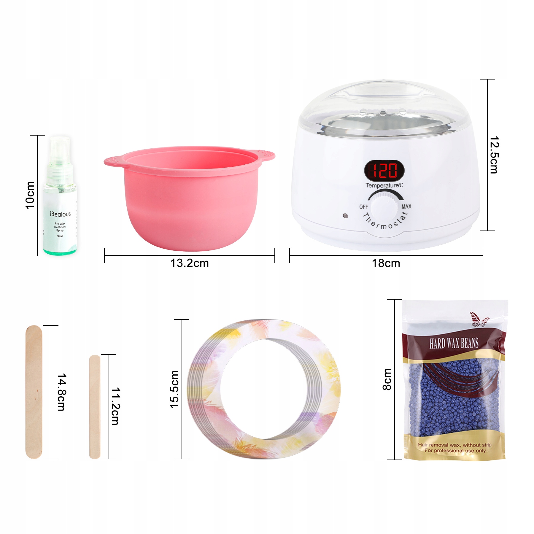 Набір включає 1 500 мл цифровий воскоплав, 1 знімний алюмінієвий контейнер, 1 силіконовий лоток, 5 упаковок воскових зерен (по 100 г кожна), 30 дерев’яних аплікаторів для тіла та брів, 10 кілець проти плям, 2 розпилювачі (30 мл). кожен) для підготовки та заспокоєння шкіри.