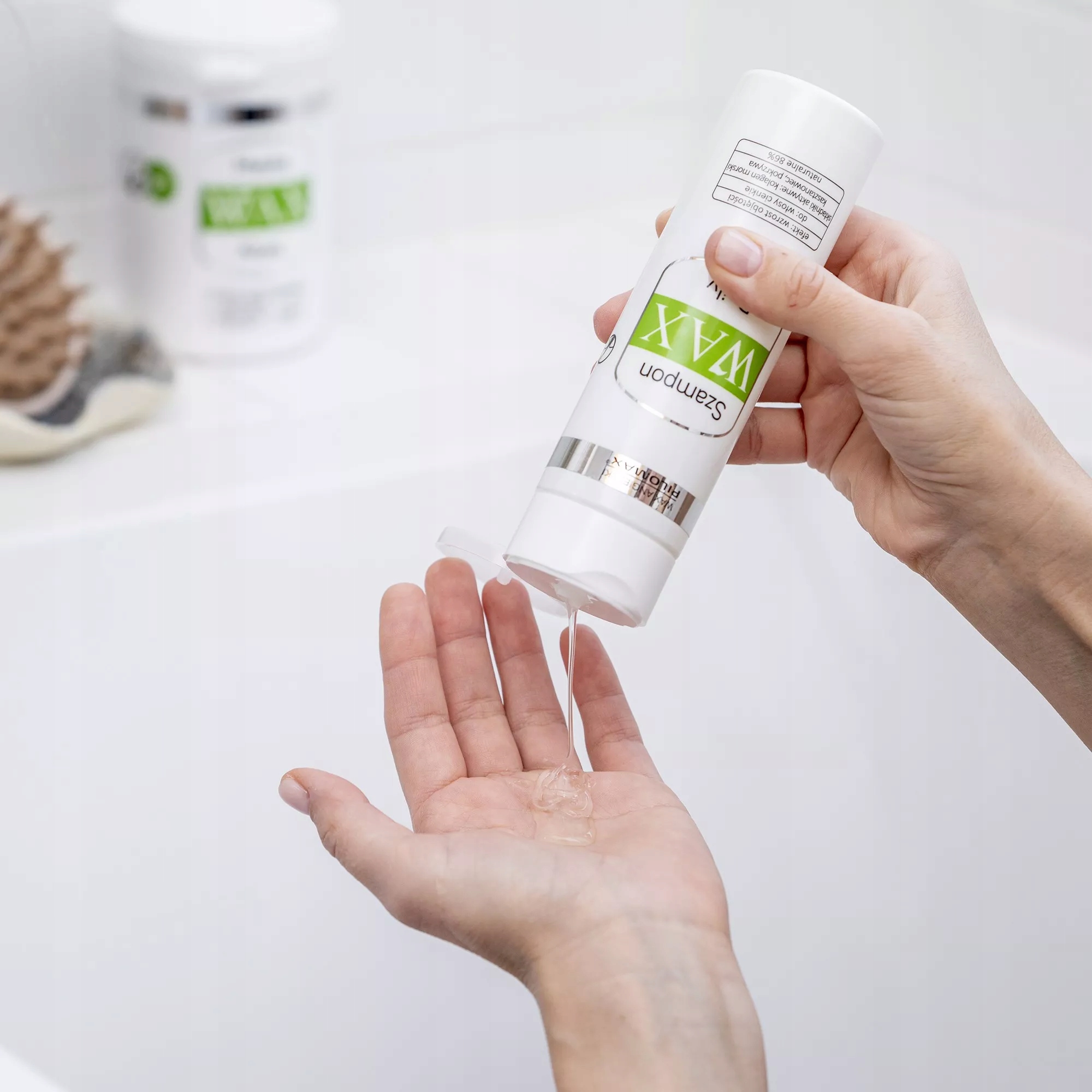 шампунь, який дає восковий воск - це шампунь для тонкого волосся. миття шкіри голови та волосся. Продукт промивається обережно і в той же час ефективно. Дає блиск для волосся, зміцнювати, зволожувати і згладити. Екстракт кропиви зменшує себорею та покращує мікроциркуляцію шкіри голови. Ефективно запобігає надмірному випадання волосся, зміцнює його, надаючи блиск і м'якість. Каштан -має антизапальні властивості і має анти -брусні властивості. Морський колаген робить волосся більш еластичними, збільшує їх еластичність та підйомники біля коренів, не обтяжуючи їх.