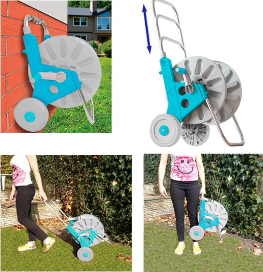 - Великі опорні колеса діаметром 18 см, що полегшує використання комплекту шлангів.