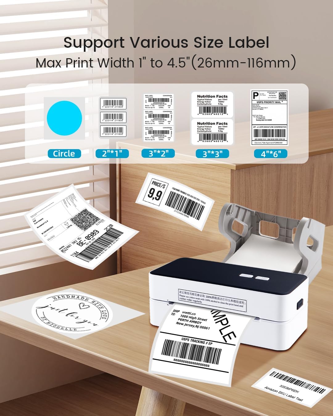 - Висока сумісність: цей термопристрій для виготовлення етикеток сумісний майже з усіма платформами доставки та електронної комерції, включаючи Amazon, Ebay, Shopify, Esty, ДБЖ, DHL та інші транспортні етикетки. Він в основному використовується для друку транспортних етикеток, цінників, складських етикеток, етикеток DHL, етикеток зі штрих-кодом, етикеток із круглим логотипом, етикеток з адресами, етикеток для продуктів харчування та всіх необхідних вам етикеток