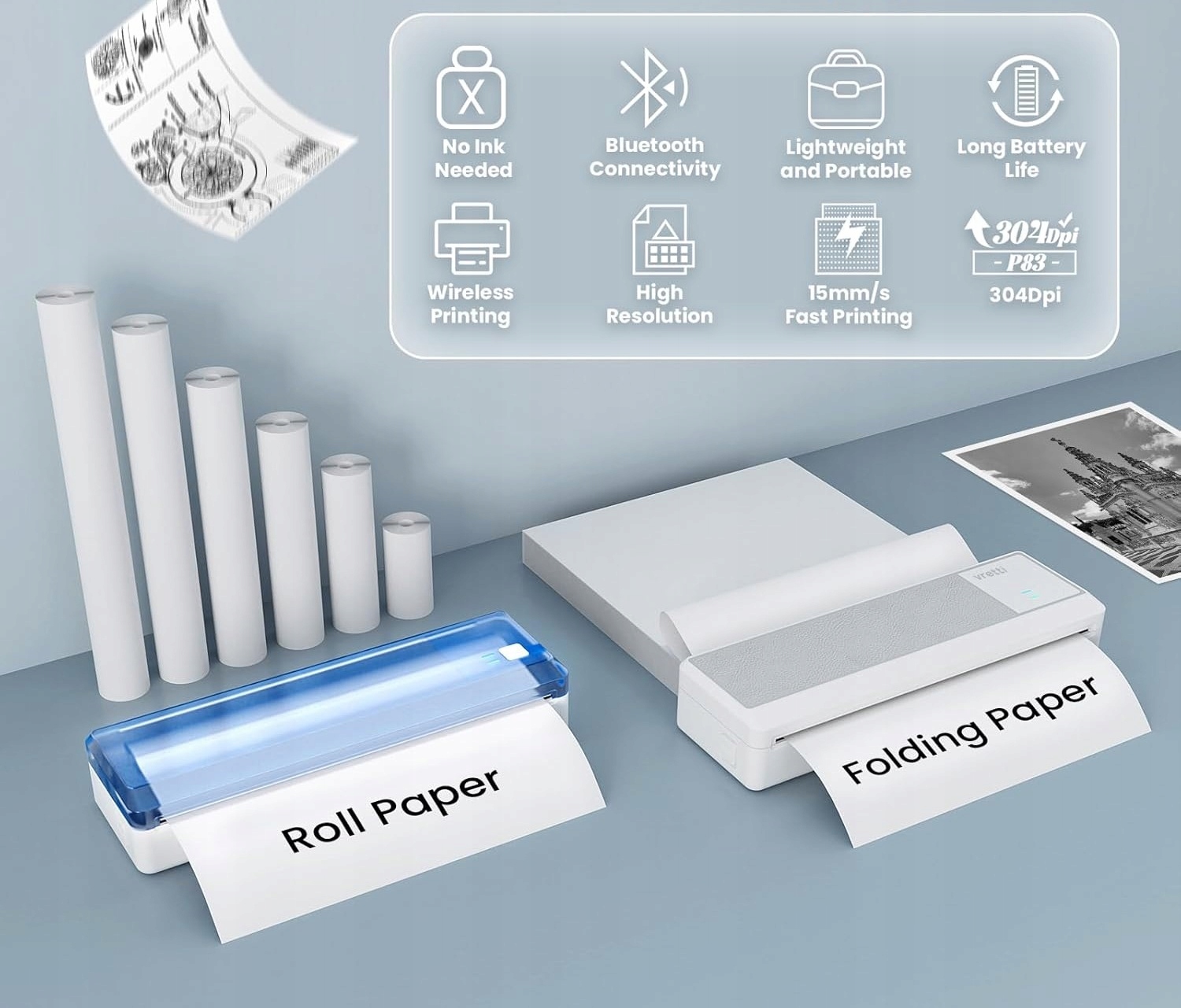 vretti P83 - це компактний та ефективний мобільний тепловий принтер A4 , ідеально підходить для домашнього, офісу та використання подорожей. Завдяки технології теплового друку це усуває необхідність туші, тонера або розмальовки, що робить його економічним та без проблем. підключення Bluetooth та USB дозволяє швидко та зручно друкувати з пристроїв із iOS, Android, Windows та Mac OS . Принтер пропонує високоякісні відбитки у роздільній здатності 304 dpi , що робить текст та графіку різким та розбірливим.