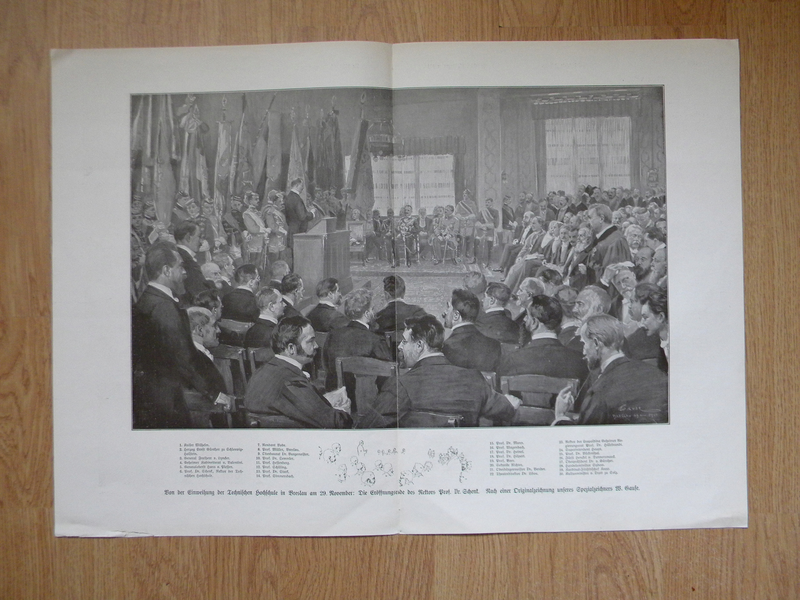 Оригінальна гравюра 1910 року із зображенням зали Вроцлавського науково-технічного університету. Промова тодішнього ректора під час церемонії відкриття Konignische Technische Hochschule, Бреслау, у листопаді 1910 року.