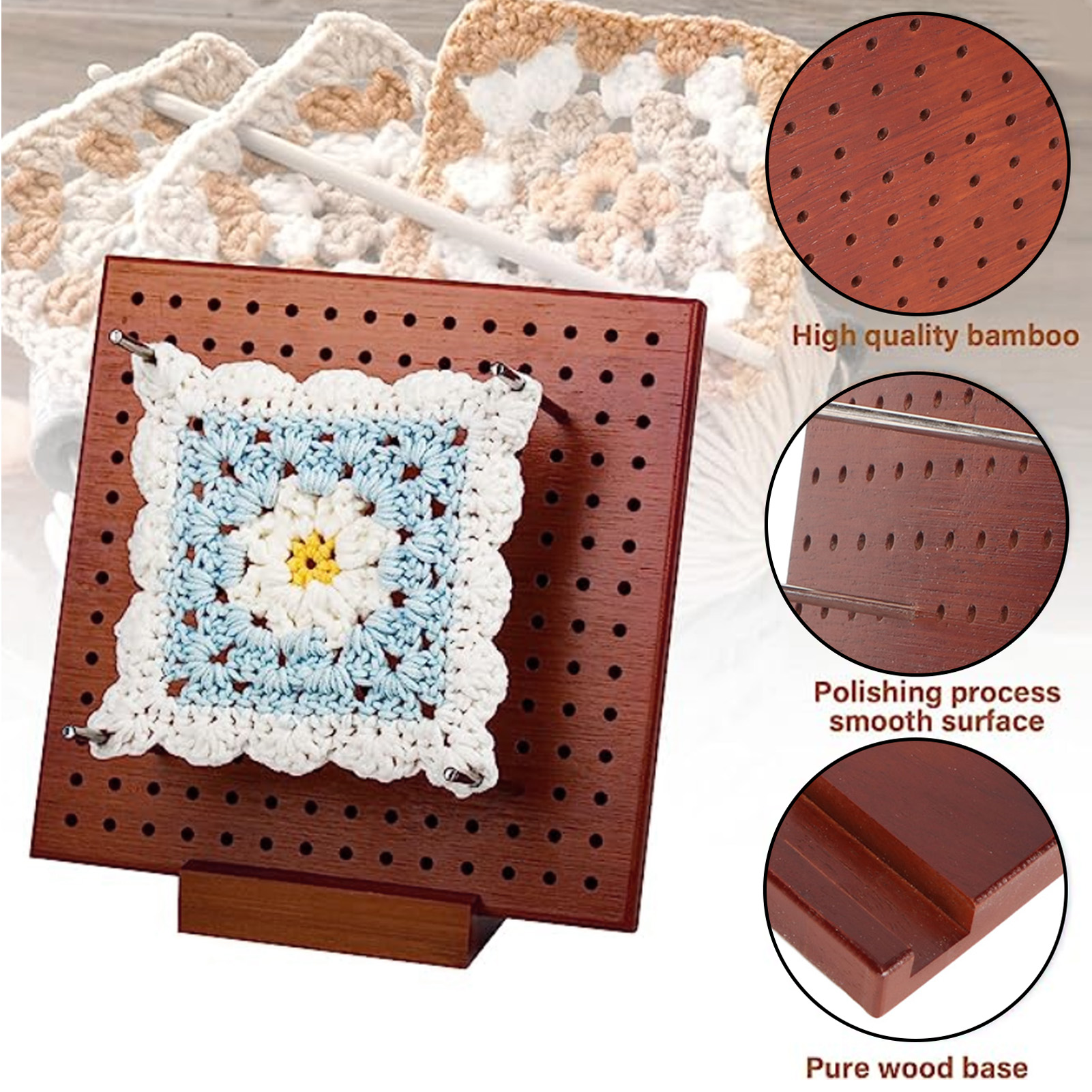 3. Міцна конструкція: квадратна пробка бабусі була відшліфована і пофарбована багато разів, поверхня слизька, вільна від задирів, і неприємного запаху немає. Ви можете використовувати його, не боячись неприємного запаху та поранення руки. Він виготовлений з міцної деревини, яка є міцною і забезпечує чудовий досвід при в'язанні.