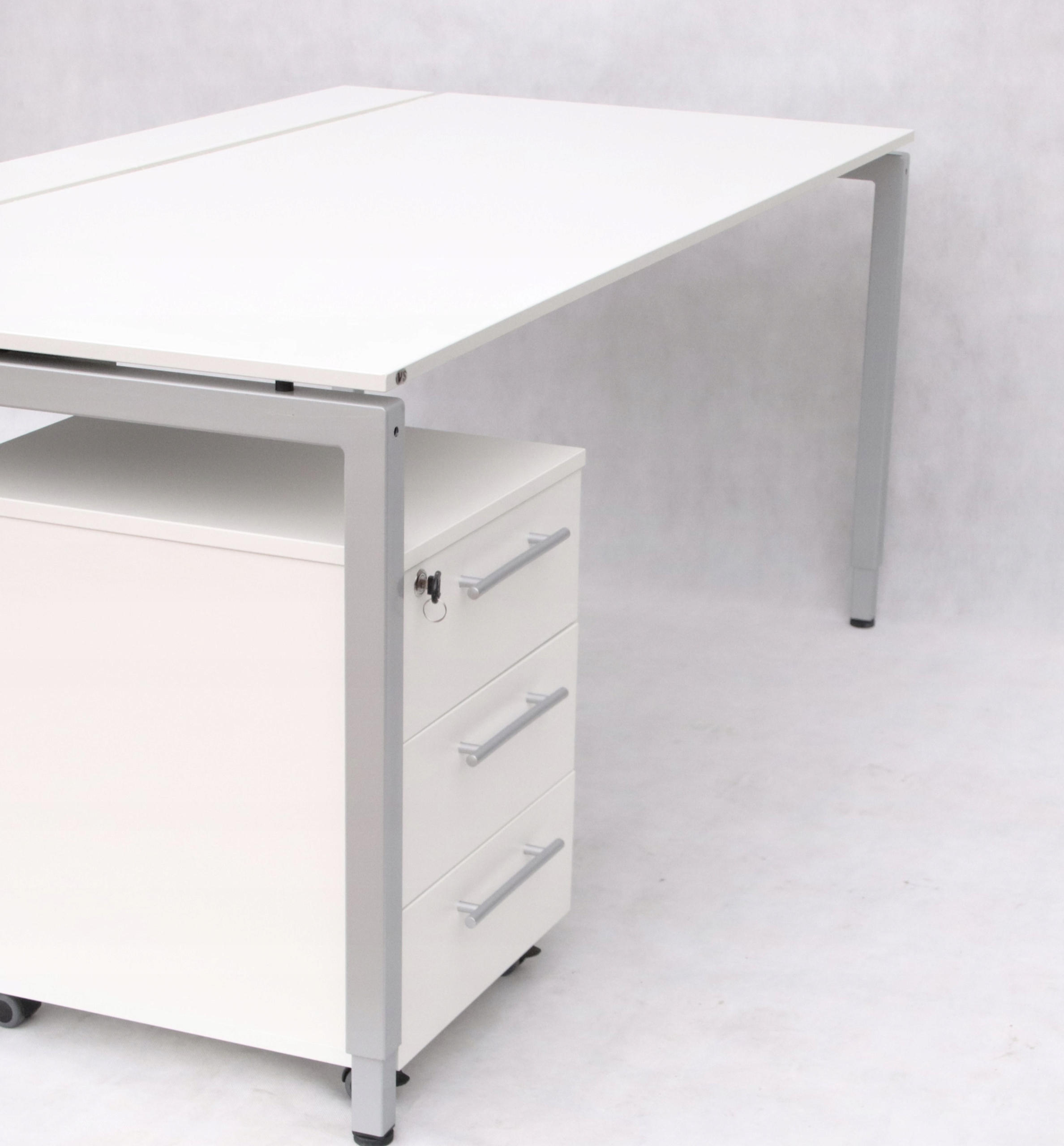 Стіл VS — це поєднання простого дизайну та високоякісних матеріалів. Стільниця складається з трьох елементів - основної дошки і двох менших, що відкриваються. Використане рішення дозволяє зручно розмістити кабель. Спеціальна кришка у вигляді щіток дозволяє витягувати кабелі в будь-якому місці. Під стільницею є тканинна ручка і кабельна направляюча, що значно полегшує дотримання порядку. Стіл оснащений ніжками, які вкручуються в металеву раму і регулюються для забезпечення повної стійкості меблів. Висота столу регулюється, що дозволяє комфортно працювати як невисоким, так і високим людям.