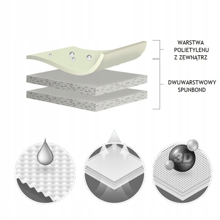 Верхня кришка виготовлена з 3-шарового матеріалу - двошарового СПАНБОНД покритий із зовнішнього боку ПОЛІЕТИЛЕНОМз високоюстійкістю до УФ-променів та атмосферних опадів.